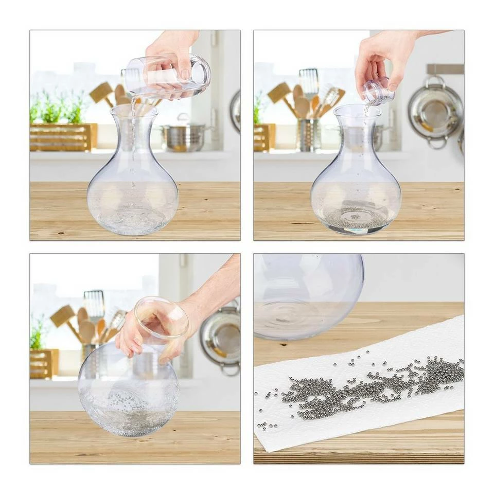 Putzperlen im 1000er Set in Aufbewahrungsdose Karaffen und Vasen lassen sich oft nur schwer reinigen und sehen dadurch nach einer Weile nicht mehr schön aus. Vor allem in den schwer erreichbaren Ecken können sich hartnäckige Rückstände und Verschmutzungen bilden. Die Edelstahlperlen entfernen dank simpler Physik, ganz ohne Zugabe chemischer Reinigungsmittel, Schmutz und andere Ablagerungen. Dazu werden die Reinigungsbälle einfach mit heißem Wasser in das Gefäß gegeben und geschwenkt.