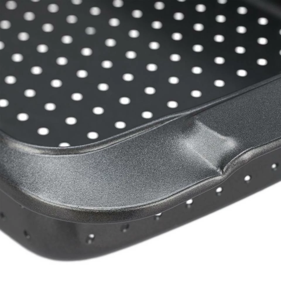 Knusperblech für feste Teige Mit der eckigen Backform wird der Traum vom knusprigen Teigboden wahr. Durch die kleinen Löcher im Boden und Rand der Form kann die Luft im Backofen besser zirkulieren und überschüssige Feuchtigkeit entweicht. Das Ergebnis ist eine besonders krosse Tarte, Quiche oder knuspriger Flammkuchen. Die Antihaft-Beschichtung verhindert dabei ein Anbacken des Backguts. Durch die 2 seitlichen Griffe kann auch die heiße Loch Form leicht transportiert werden.