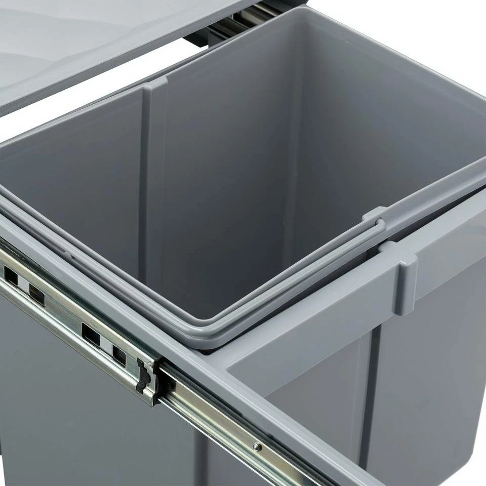 2-faches Mülltrennsystem mit Auszug Um den geringen Platz in Ihrer Küche optimal zu nutzen, ist dieser moderne Mülltrenner im grauen Deluxe Design ideal. Befestigen Sie den Küchenmülleimer dazu mithilfe des beiliegenden Montagematerials in einem Ihrer Unterschränke. Mit dem Griff lässt sich der Duoabfalleimer geschmeidig heraus ziehen. Dabei ist der praktische Abfallsammler mit 2 Fächern zur Mülltrennung ausgestattet. Die Inneneimer aus Kunststoff sind leicht zu reinigen und dank ihrer Henkel ebenso einfach zu entnehmen.