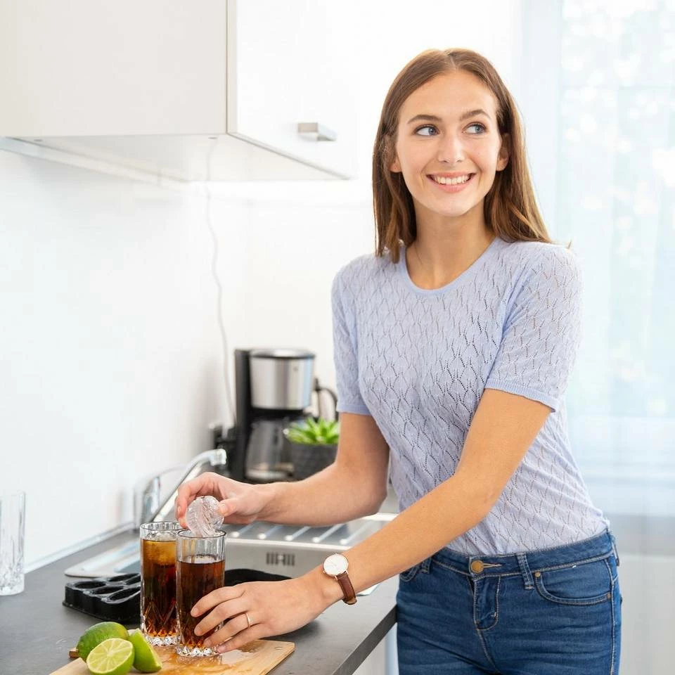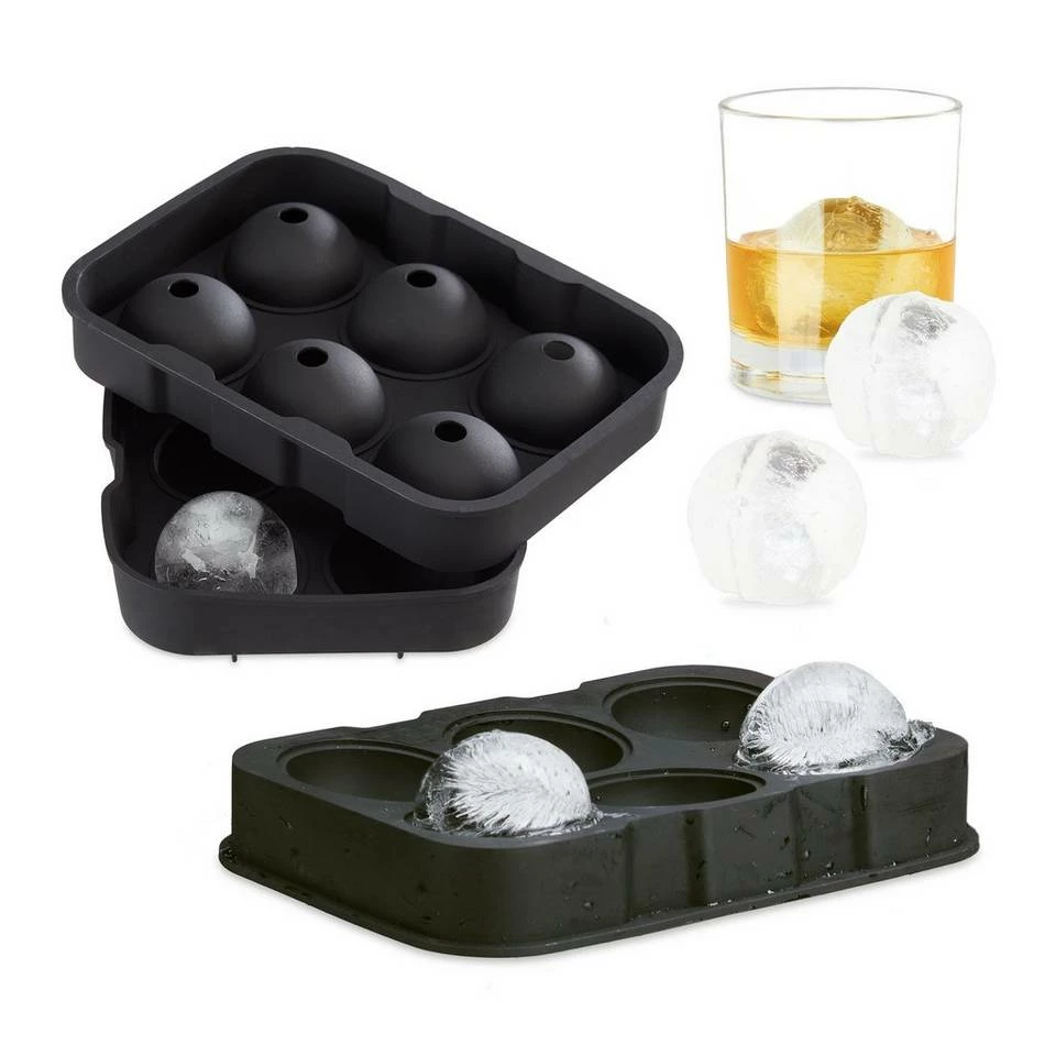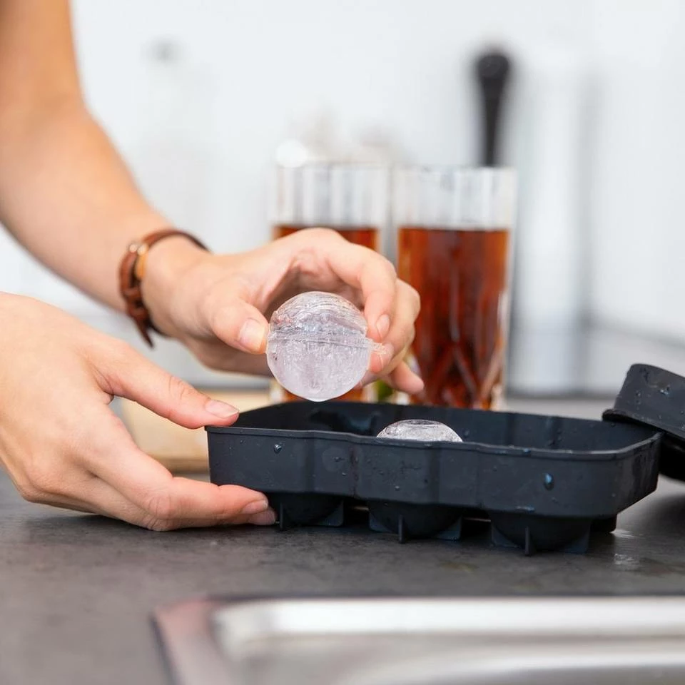 Eiskugelform aus weichem Silikon Verwöhnen Sie Ihre Gäste mit eiskalten Cocktails oder anderen leckeren Drinks! Neben der langanhaltenden Kühlwirkung überzeugen die Eiskugeln als Hingucker im Glas. Die 2-teilige Eiskugelform ist denkbar leicht zu bedienen. Durch die Öffnungen gießen Sie Wasser ein. Die beiden Teile stecken Sie ineinander, sodass kein Tropfen entweichen kann. Ein paar Stunden später lassen sich die Eiskugeln das des flexiblen Materials problemlos aus der Silikonform lösen. Nach dem Gebrauch ist die Reinigung in der Spülmaschine kein Problem. Hinweis zur Verwendung: Am einfachsten lässt sich die Eiskugelform nutzen, wenn die Kammern unter fließendem Wasser befüllt werden. Die obere und die untere Schale dabei zusammenstecken. Wasser kann sich in diesem Fall auch auf der oberen Abdeckung sammeln. Das ist kein Problem und die Eiskugel-Form kann so ins Gefrierfach gestellt werden. Am nächsten Tag, haben Sie die gewünschten Kugelformen.