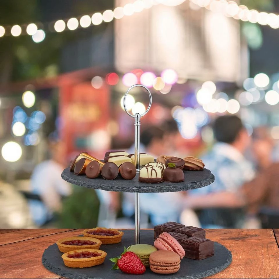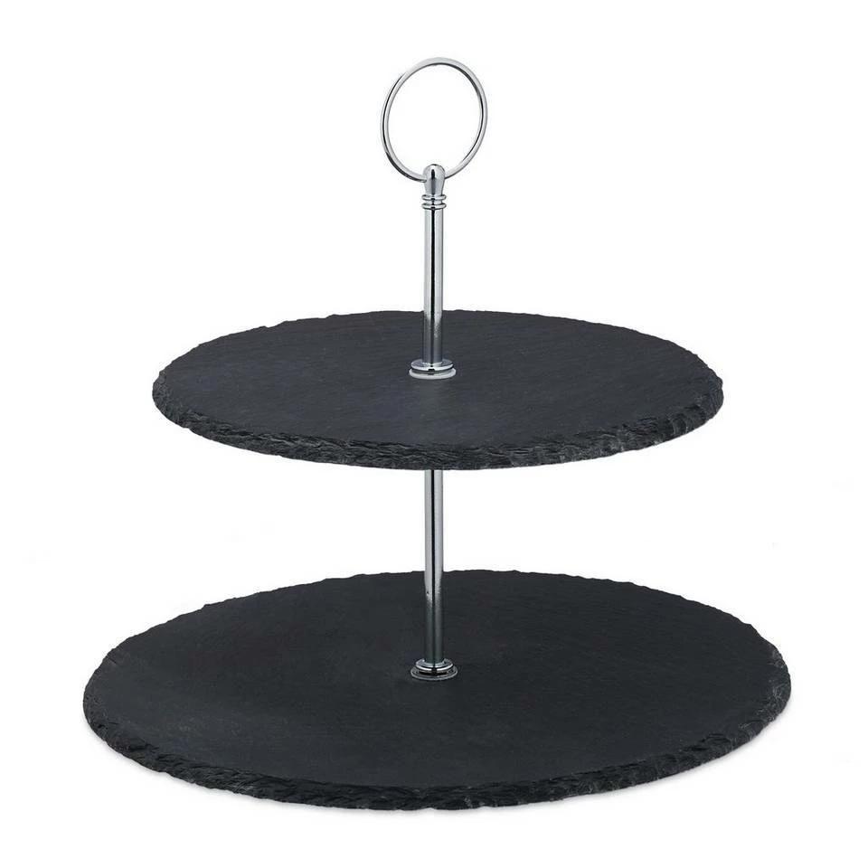 Edle Schieferetagere mit 2 Etagen Mit dieser eleganten Etagere wird die nächste Geburtstags- oder Teeparty garantiert ein Erfolg. Auf der runden Kuchenetagere mit 2 Etagen servieren Sie Ihren Gästen süße Backwaren wie Kuchen & Cupcakes oder auch herzhafte Snacks wie Fingerfood & Käsehäppchen. Das schicke Design aus Schiefer & glänzendem Metall ist dabei auf jedem Tisch ein echter Hingucker. Dank der Schoner aus Schaumstoff steht der Servierständer stabil & die Tischoberfläche wird vor Kratzern geschützt. Bitte beachten Sie: Bei Schiefer handelt es sich um ein Naturprodukt. Dieses geschichtete Gestein lässt sich nicht 100% gerade zuschneiden. Abbruchkanten können variieren.