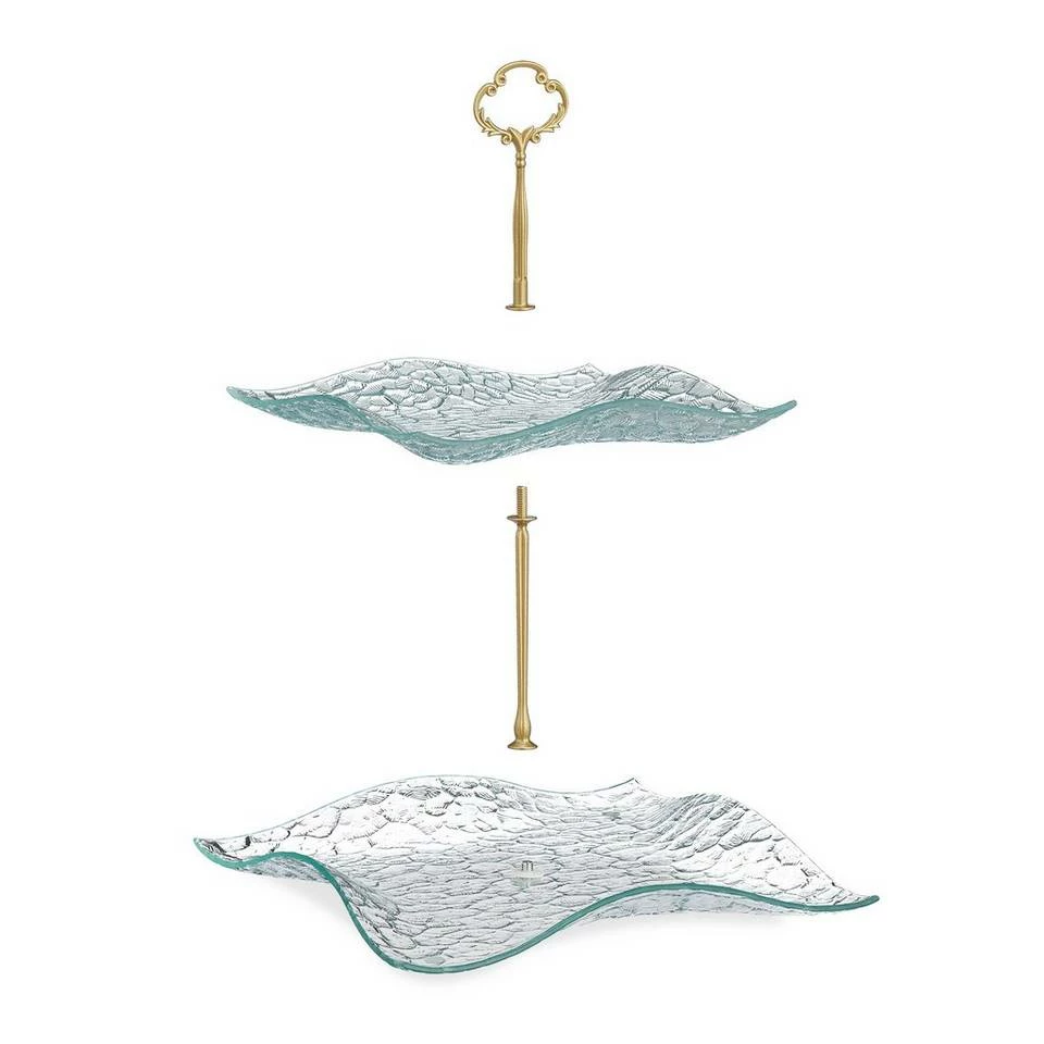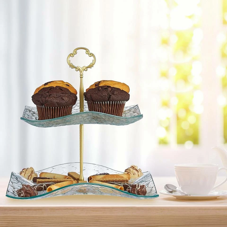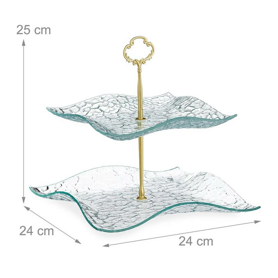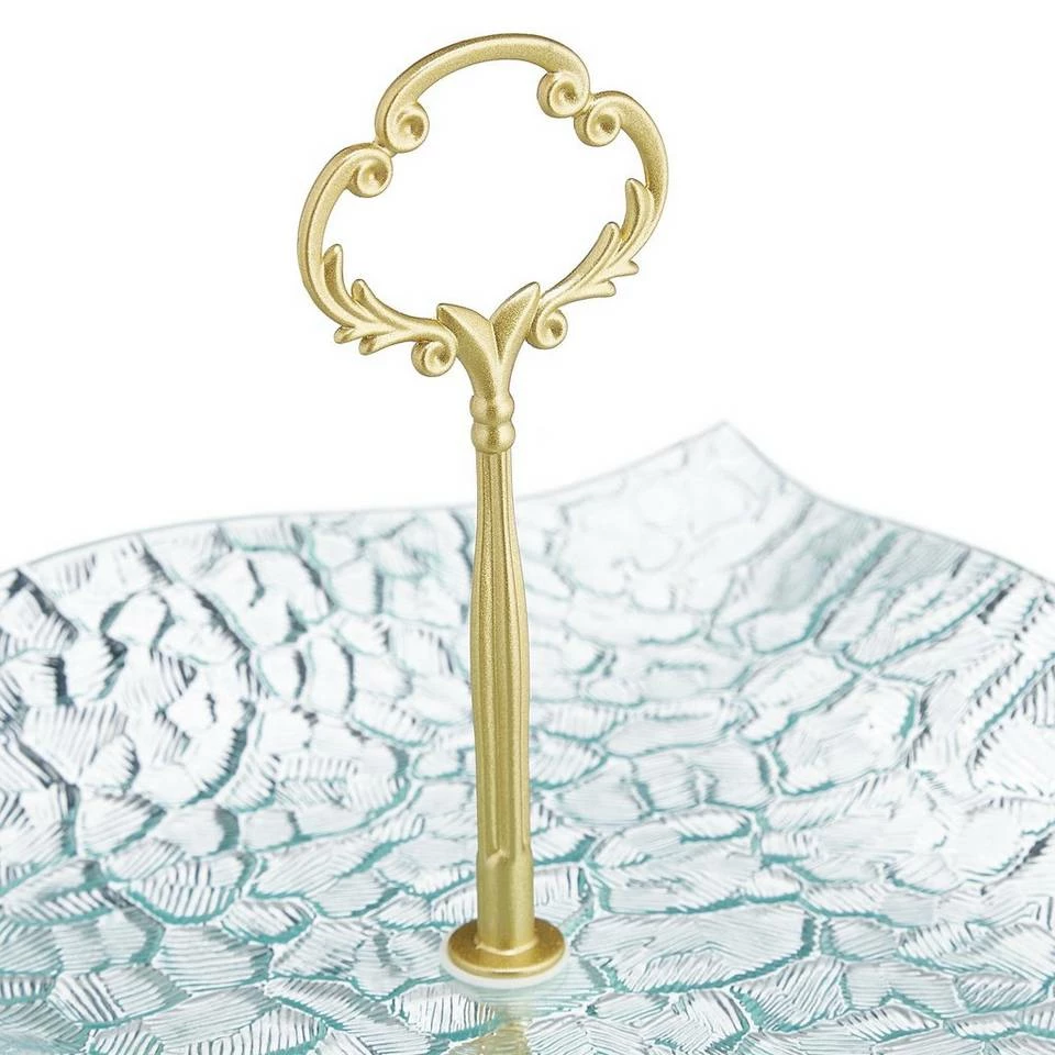 2-stöckige Konfektetagere in antiker Optik Mit der Glas Etagere servieren Sie stilvoll Pralinen, Kekse, Macarons, kleine Kuchen oder herzhafte Leckereien. Durch die 2 Etagen können Sie Ihr Essen anrichten, ohne dass es viel Platz auf dem gedeckten Tisch oder dem Buffet einnimmt. Der Servierständer überzeugt dabei mit seinem edlen Vintage Design aus geschwungenen Servierplatten aus Strukturglas und dem verzierten goldenen Henkel. An diesem können Sie die Tee Etagere komfortabel transportieren.