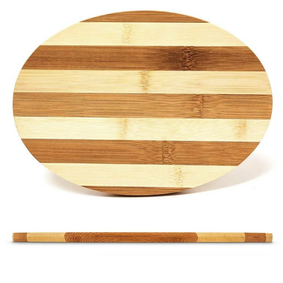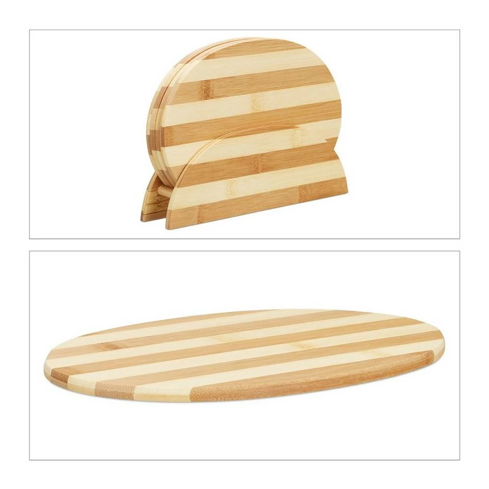 Frühstücksbrettchen mit natürlichem Streifenmuster Das Frühstücksbrettchen Set mit praktischen Ständer kommt im kompletten Streifenmuster. Auf eine Gesamtgröße von 25 x 5,5 x 18,5 cm ist dieses Set nicht nur auf dem Frühstückstisch praktisch, sondern auch dekorativ in der Küche. Die ovalen Brettchen sind jeweils ca. 0,5 cm dick. Insgesamt messen die Brettchen jeweils ca. 25 x 18 cm in Länge und Breite. Aufgrund ihrer Form finden Brotscheiben oder Brötchenhälften den richtigen Platz darauf.