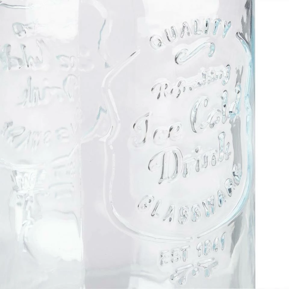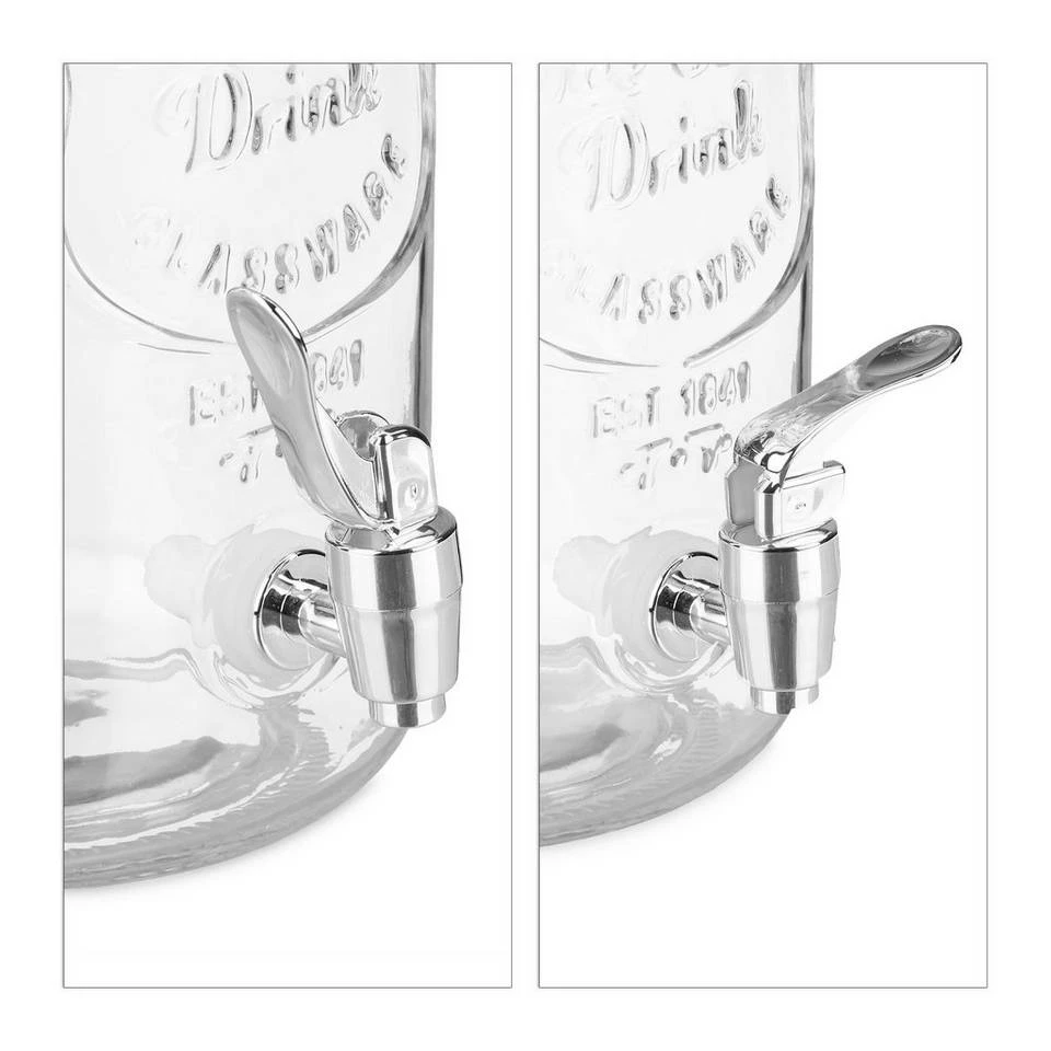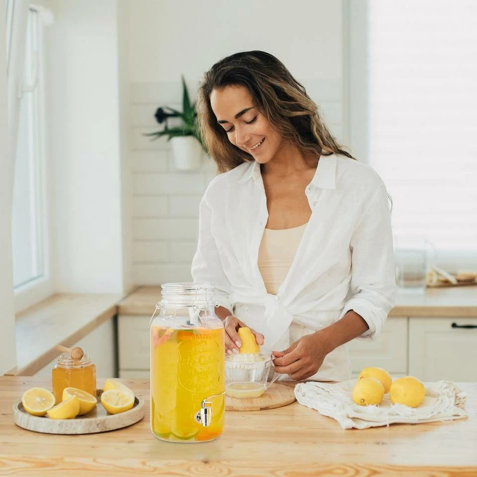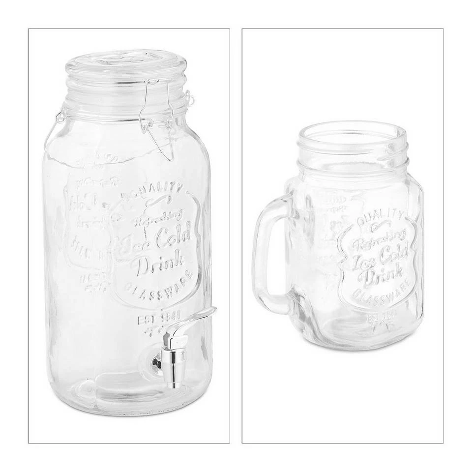 Großes Zapfglas mit 4 Trinkgläsern An heißen Sommertagen sorgen Sie mit diesem Glasgetränkespender im dekorativen Retro-Design für Erfrischung unter kleinen und großen Gästen. Ein optisches Highlight im transparenten Trinkspender ist Infused Water, das Sie mit verschiedenen Obst- und Gemüsesorten sowie Kräutern mit wenigen Handgriffen selbst herstellen können. Den Wasserspender verschließen Sie dank des Bügelverschlusses sicher. Zum Zapfglas gehören 4 dekorative Trinkgläser. Hinweis: Reinigen Sie die Gefäße nach Benutzung zügig per Hand und lassen Sie alle Bestandteile ausreichend lufttrocknen.