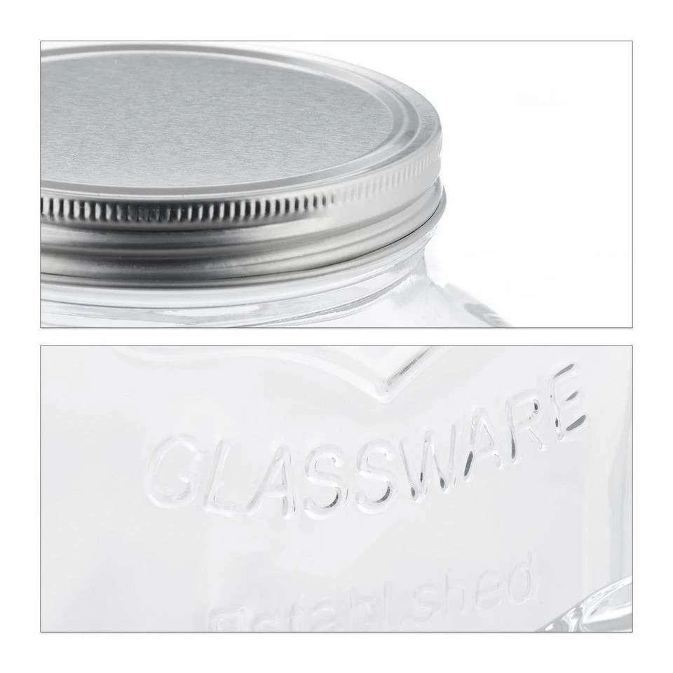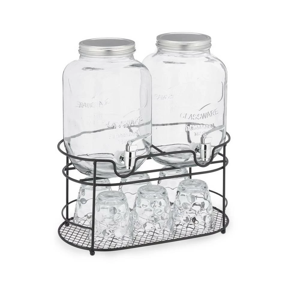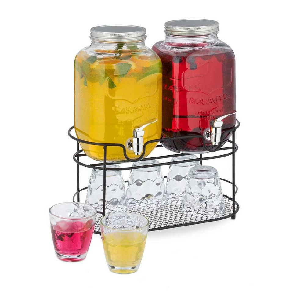 Retro Cocktailspender Set für die nächste Gartenparty Mit diesen coolen Trinkspendern bringen Sie sommerlichen Flair auf die nächste Gartenparty oder in Ihre Hausbar. Der Einmachglas Look mit Schraubdeckel und Prägung wird mit kultigem Zapfhahn zum Einschenken der Getränke abgerundet. Auf dem industriellen Eisengestell sind die Limospender direkt einsatzbereit. Füllen Sie aufgepepptes Wasser mit Früchten sowie selbstgepresste Säfte, Limonaden und mehr in die stylischen Trinkgläser im 6er Pack. So wird Ihre Party ganz sicher zum Hit.