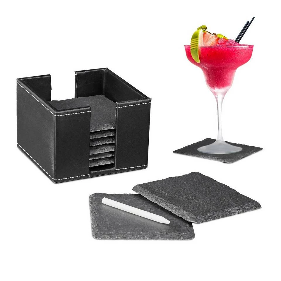 Dekorative Glasuntersetzer mit Kreide zum Beschriften Sind Gäste eingeladen, kann Ihr Esstisch schnell durch das Abstellen von Gläsern oder Tassen unter Flecken sowie Kratzern leiden. Mit diesen dekorativen Glasuntersetzern im 8er Set können Sie das ganz einfach verhindern. In der modernen Kunstlederbox sind die quadratischen Schieferplatten übersichtlich aufbewahrt und können griffbereit auf dem Tisch platziert werden. Ein kleines Highlight ist die Kreide, mit der Sie und Ihre Gäste die Raclette Untersetzer individuell gestalten können. Bitte beachten Sie: Bei Schiefer handelt es sich um ein Naturprodukt. Dieses geschichtete Gestein lässt sich nicht 100% gerade zuschneiden. Abbruchkanten können variieren. In Dicke, Länge und Breite kann es daher ebenso zu leichten Abweichungen kommen. Tipp: Die Kreide kann durch das Abwischen mit einem feuchten Tuch ganz leicht von den Untersetzern entfernt werden.
