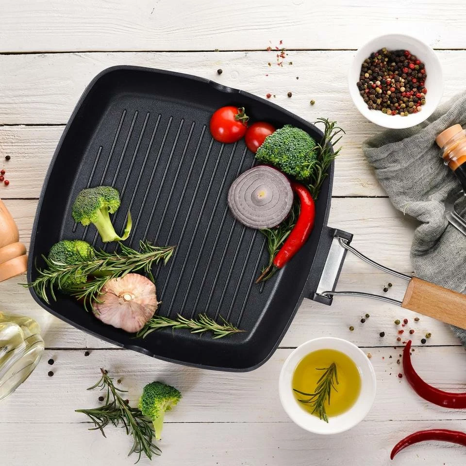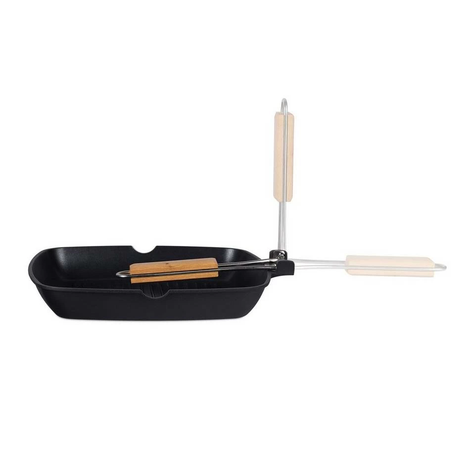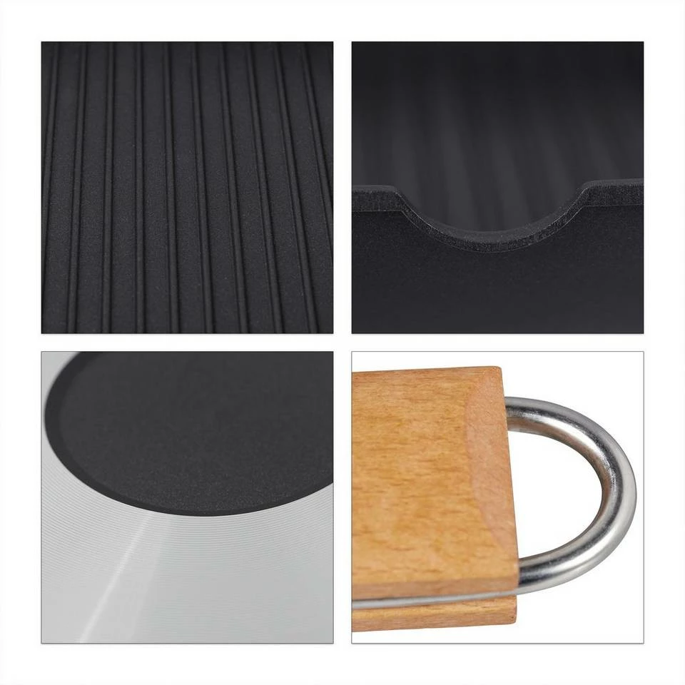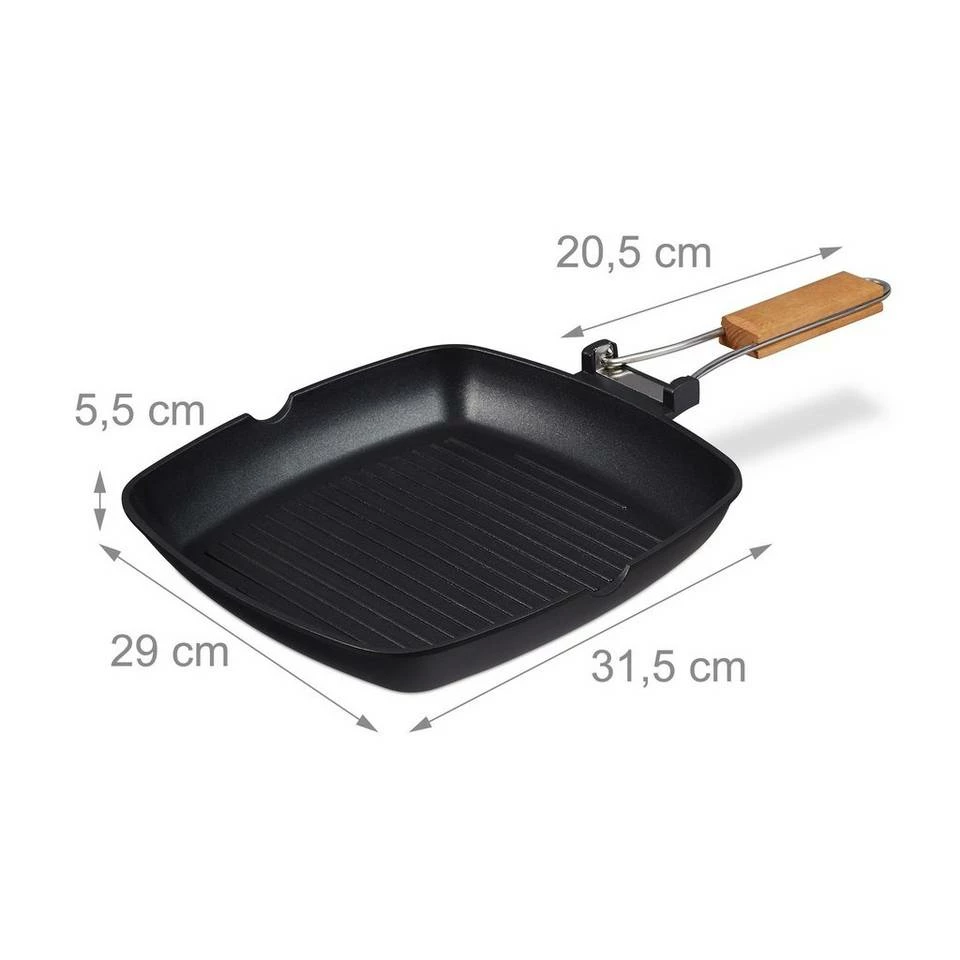 Antihaft Pfanne für leckere Speisen Mit der Grillpfanne bereiten Sie Fleisch, Fisch, Sandwiches, Spiegeleier und andere Köstlichkeiten zu, ob im Rahmen einer Grill-Session oder auf dem heimischen Herd. Die Rillen helfen, Fette oder Öle auf Distanz zu halten. Die Antihaftbeschichtung sorgt dafür, dass Sie weniger dieser Schmierstoffe benötigen und erlaubt darüber hinaus eine einfache Reinigung. Der Holzgriff lässt sich klappen, abnehmen und zum Aufhängen in der Küche nutzen.