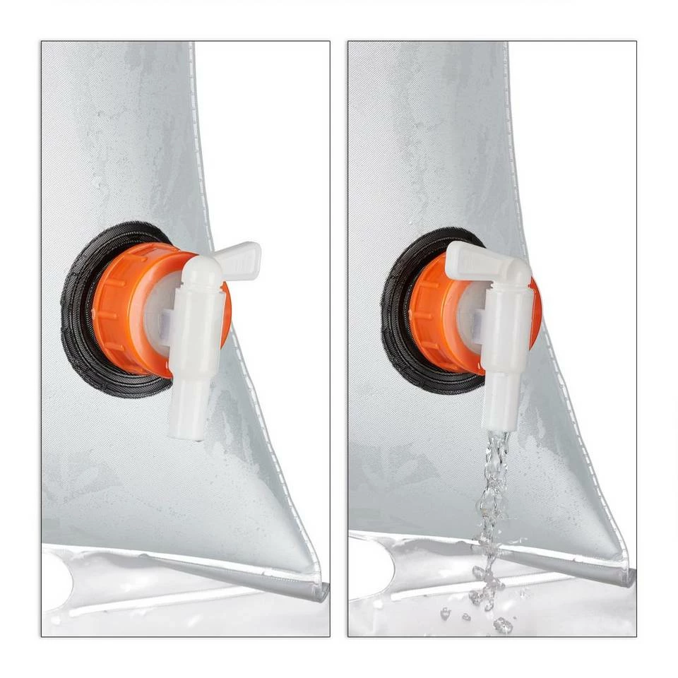 Platzsparender Trinkwasserkanister mit Hahn Ob auf dem Festival, auf Reisen oder Campingausflügen: Wenn Sie unterwegs frisches Wasser trinken möchten, ist der faltbare Wasserkanister für 10 Liter genau das Richtige. Im Gegensatz zu massiven Tanks lässt sich der Kanister bei Nichtgebrauch einfach zusammenfalten, sodass er nur noch sehr wenig Raum für sich beansprucht. Der Transport ist dank der beidseitigen Grifföffnungen ein Leichtes. Der Auslasshahn erlaubt Ihnen, die Wassermenge genau zu regulieren – praktisch!