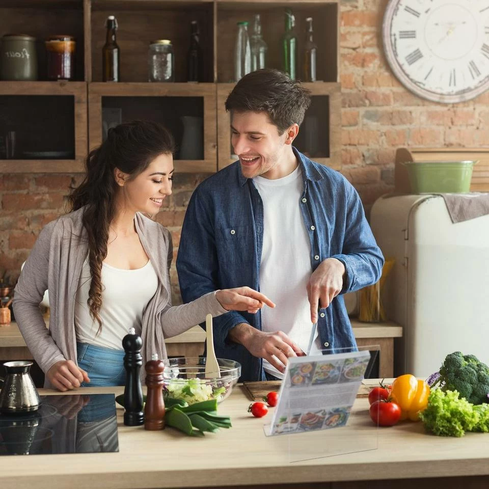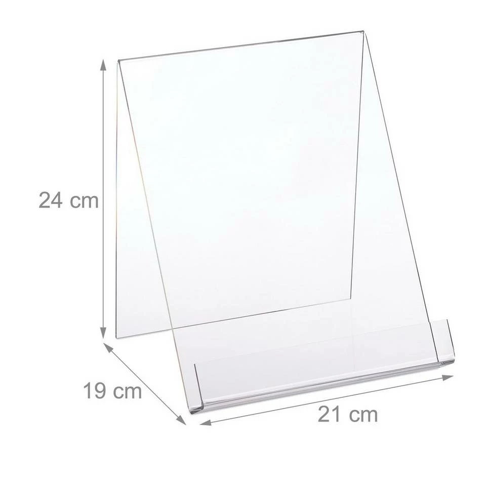 Vielseitiger Buchaufsteller für Tisch und Regal Der durchsichtige Buchaufsteller ist ein vielseitiger Helfer überall im Haus. Große Bücher bis DIN A4 finden auf dem hohen und breiten Buchhalter Platz. Die gebogene Kante sorgt dafür, dass die aufgeschlagene Buchseite nicht verblättert. Nutzen Sie den stabilen Leseständer aus Acryl als Kochbuchhalter oder Schulbuchständer. Der glasklare Aufsteller präsentiert auch dekorativ das persönliche Lieblingsstück, wie zum Beispiel CDs oder LPs.
