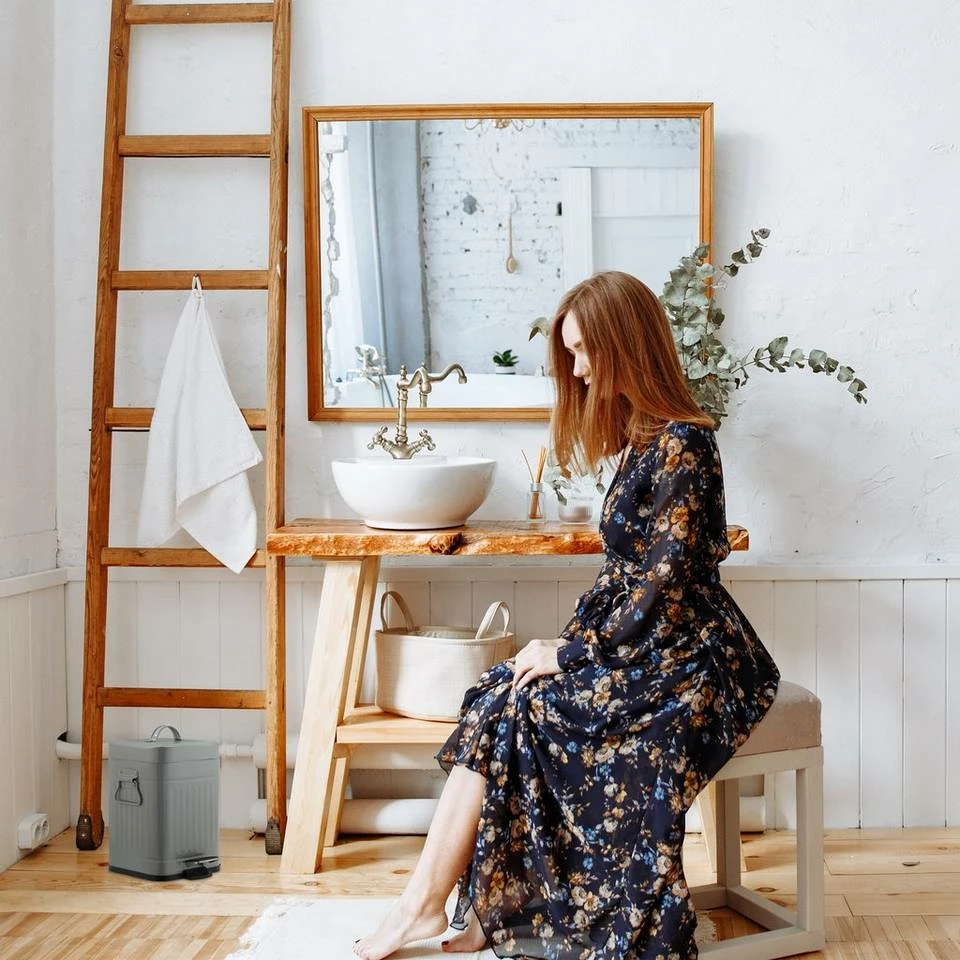 Hygienemülleimer für das Bad Dieser kleine Treteimer hat die ideale Größe, um Hygieneabfälle im Bad, Kosmetikabfälle am Schminktisch oder Bioabfälle in der Küche zu sammeln. Der Deckel des WC-Eimers lässt sich durch ein Trittpedal ganz einfach mit dem Fuß öffnen, die Absenkautomatik sorgt dafür, dass er anschließend leise zuklappt. Um den Müllbehälter zu entleeren, können Sie den Inneneimer unkompliziert herausnehmen, aber auch der komplette Hygieneeimer lässt sich dank der seitlichen Griffe problemlos tragen.