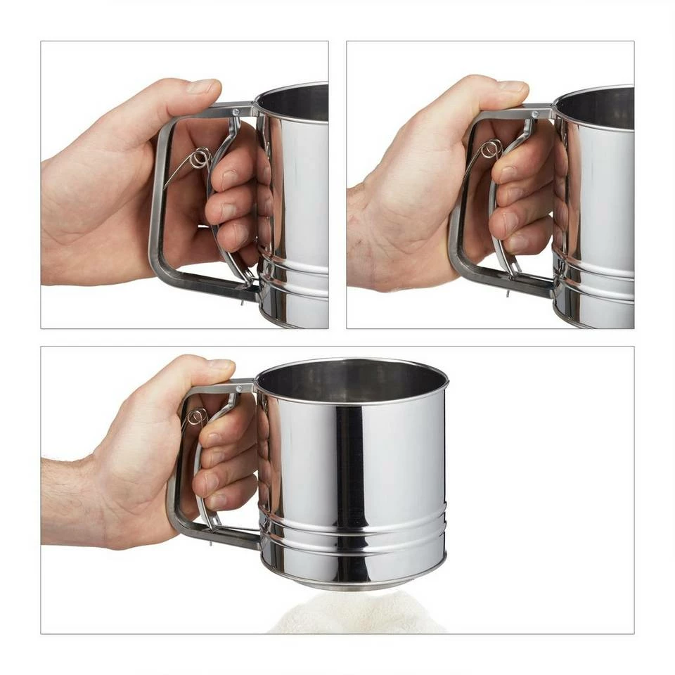 Mehlzerstäuber zum Backen & Garnieren Für ein besonders feines und fluffiges Ergebnis beim Backen sieben Sie am Besten vorher das Mehl. Mit dem feinmaschigen Mehlsieb aus Edelstahl geht das ganz einfach mit einer Hand. Sie müssen lediglich den Griff drücken und schon sieben Sie das Mehl klumpenfrei in die Schüssel oder bestäuben Ihre Arbeitsfläche. Gleichzeitiges Rühren und Sieben ist somit kein Problem. Aber auch zum ansprechenden Verzieren von Kuchen und Waffeln mit Puderzucker oder Kakaopulver ist das Backsieb ideal. Hinweis: Für eine längere Haltbarkeit, das Sieb nicht vollständig sondern nach und nach mit Mehl befüllen.