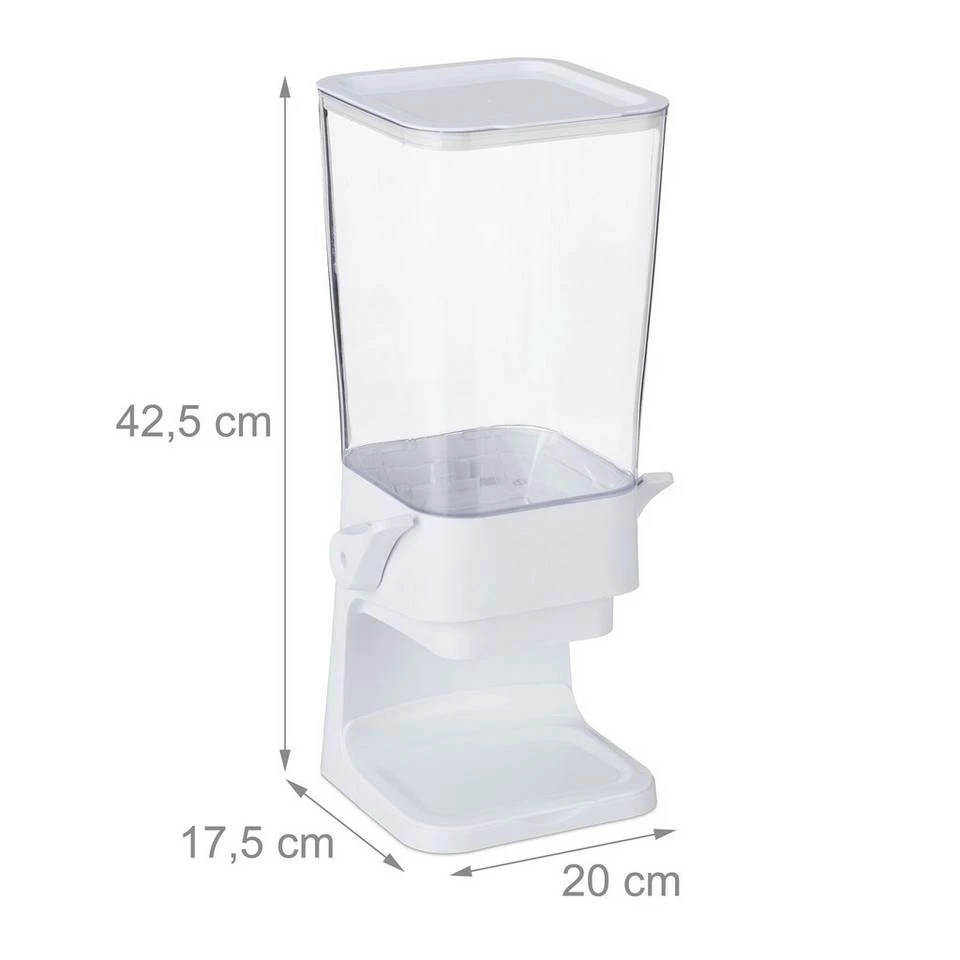 - Details: Cornflakesspender aus Kunststoff – HxBxT: ca. 42,5 x 20 x 17,5 cm – Volumen: ca. 6 Liter