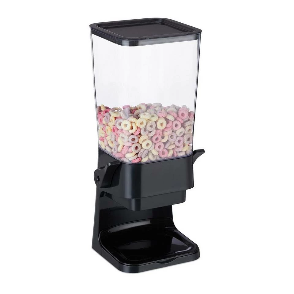 Einfacher Müslispender zum Stellen Halten Sie Ihre liebsten Frühstücksflocken frisch und geschmackvoll mit dem praktischen Cornflakesspender. Der einfache Müsliportionier erspart Ihnen das morgendliche Wühlen in Schachteln und Plastiktüten. Der große, transparente Müslibehälter wird mittels Sicherung auf der Rückseite fest verschlossen. Das Portionieren ist dank leichtgängigem Hebel denkbar einfach. Der Cerealienspender eignet sich für viele weitere trockene Lebensmittel. Nutzen Sie die Vorratsschütte als Kaffeebohnenspender, Snackautomat, Reis- oder Nudelspender.