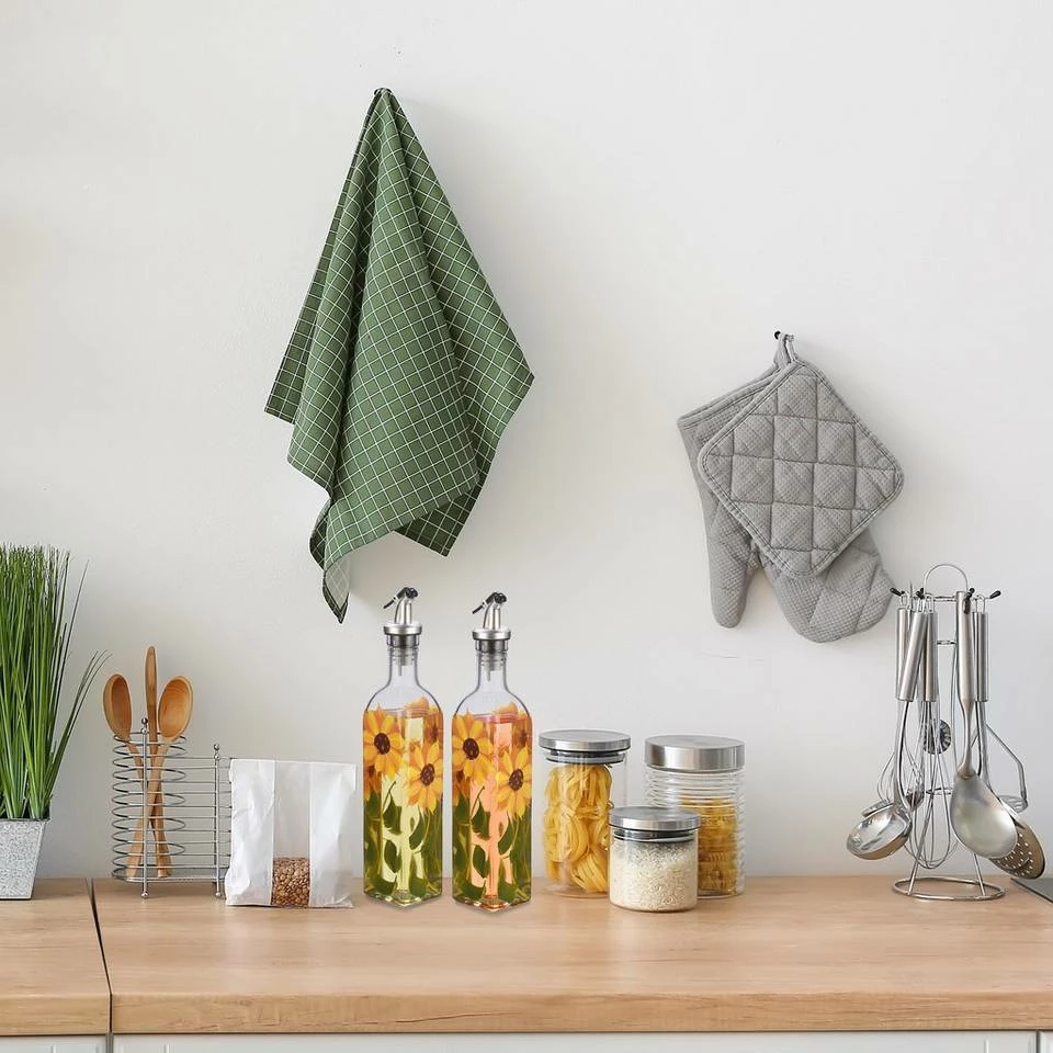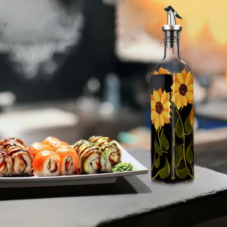 - Design: Handbemalte Öl- und Essigspender mit dekorativem Blumenmuster – Große, gelbe Sonnenblumen