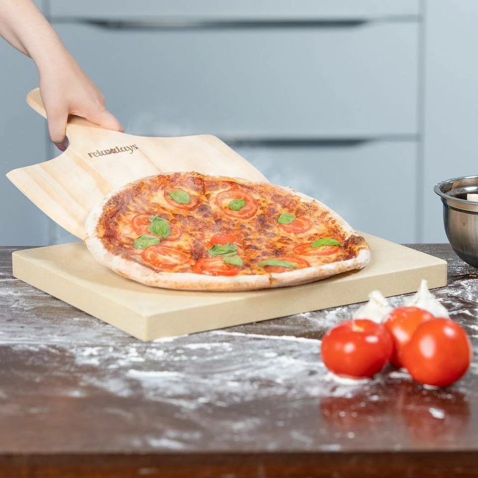 Pizzastein 3 cm mit Pizzaheber Mit diesem Pizzastein machen Sie Ihre heimische Küche zu Ihrer privaten Trattoria. Egal ob im Backofen oder auf dem Grill – der 3 cm starke Baking Stone gibt die Hitze gleichmäßig ab und nimmt Feuchtigkeit auf. So entstehen knusprige Pizzen wie frisch aus dem Steinofen. Doch auch Flammkuchen und Brot lassen sich auf dem Stein perfekt zubereiten. Mit der mitgelieferten Pizzaschaufel können Sie die fertige Pizza kinderleicht aus dem Ofen entnehmen.