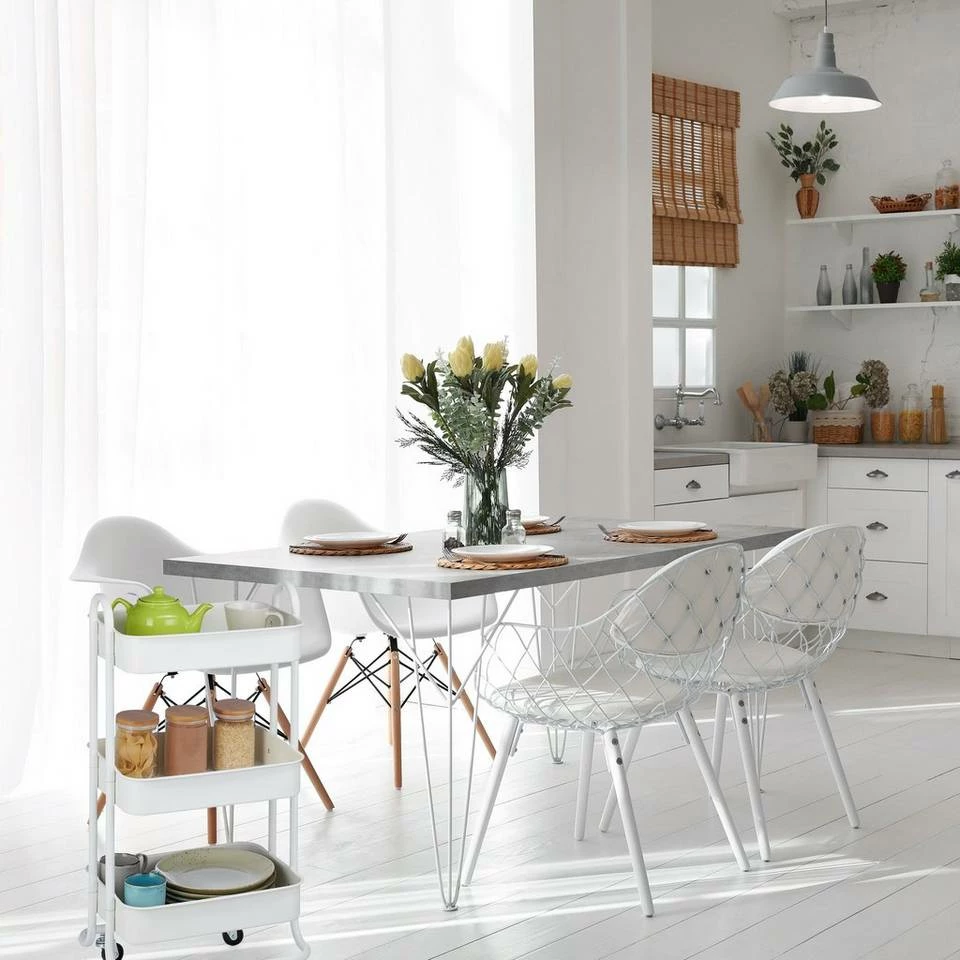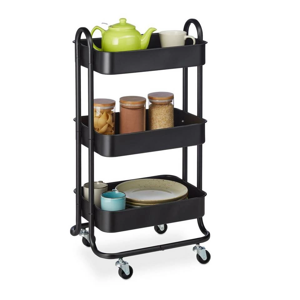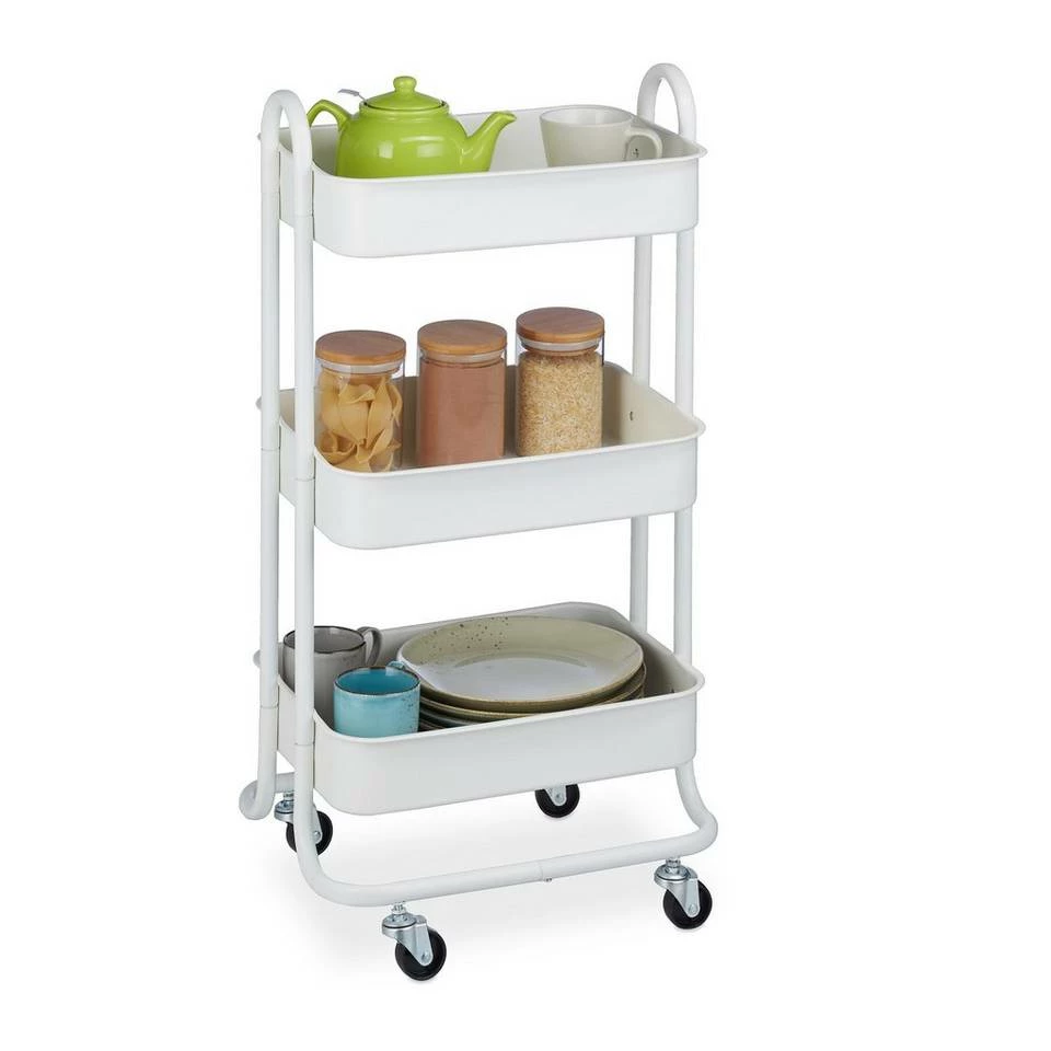 Vielseitiger Allzweckwagen für Küche, Bad und mehr Dieses Rollregal aus stabilem Metall ist im ganzen Haushalt eine praktische Hilfe. Der Etagenwagen macht als Badwagen für Handtücher, Pflegeprodukte und Putzmittel eine gute Figur, überzeugt aber auch als Servierwagen für Speisen, Getränke und Geschirr. Dabei benötigt der praktische Beistellwagen nur wenig Stellfläche und verfügt mit seinen 3 Ablagen dennoch über viel Stauraum. Mit den 360° drehbaren Rollen lässt sich der Haushaltswagen problemlos von A nach B schieben.