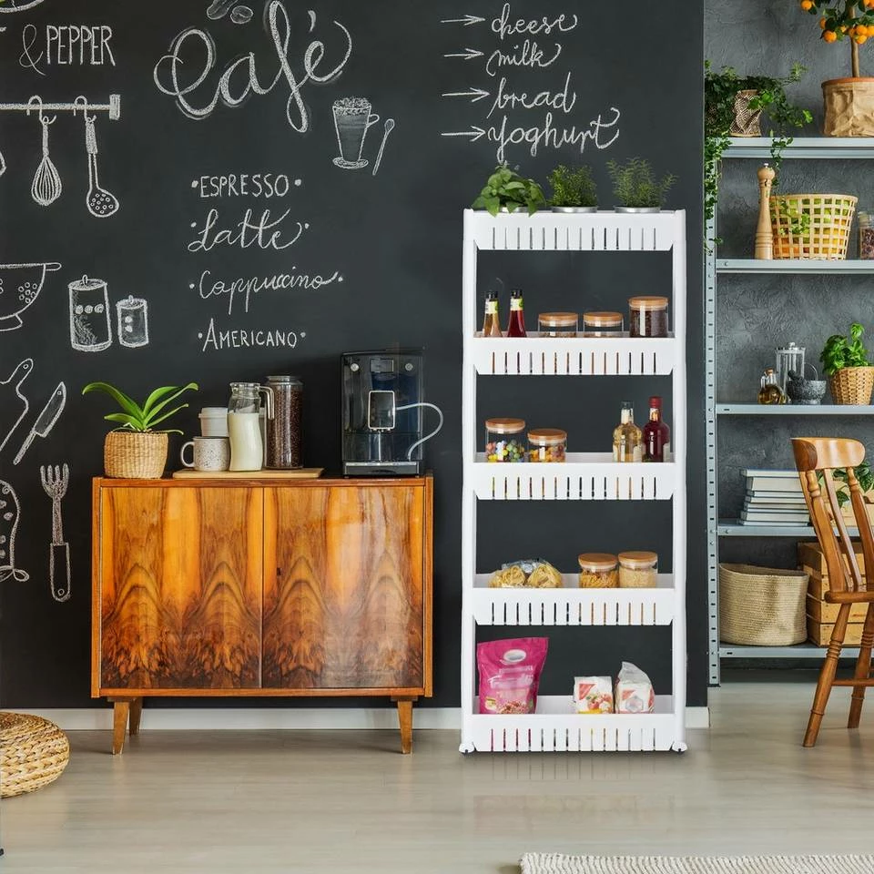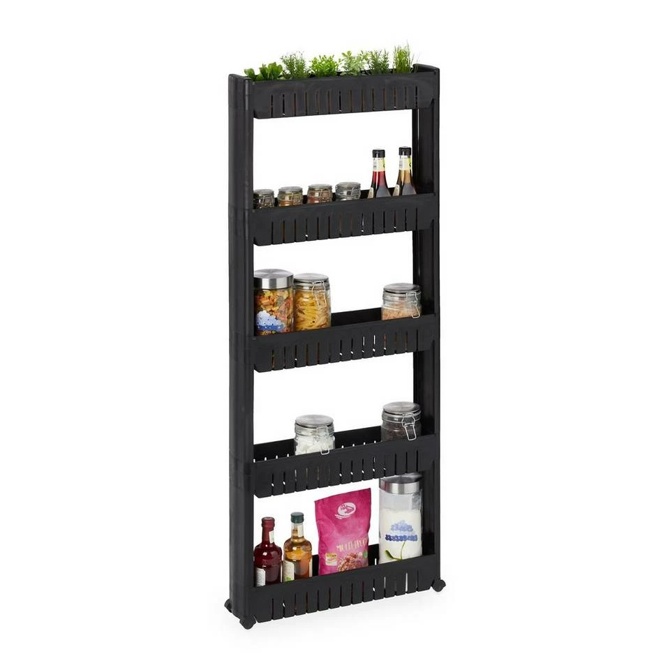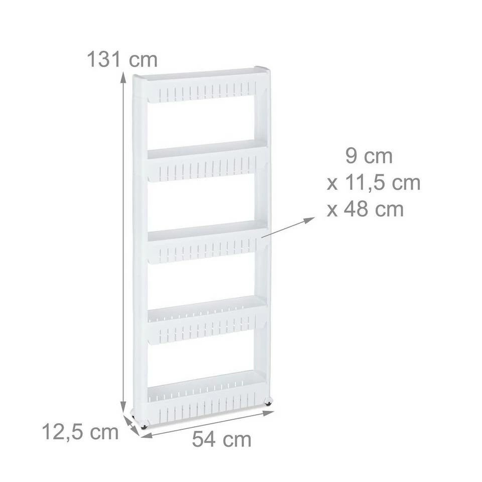 Hohes Nischenregal für schmale Zwischenräume Wenn Du Dich häufig über zu wenig Stauraum in Deiner Küche ärgerst, ist dieser platzsparende Nischenrollwagen die Lösung! Stecke das Küchenregal einfach zusammen und schon ist es einsatzbereit. Dank der geringen Breite passt das platzsparende Schieberegal auch in kleine Nischen und bietet auf einer geringen Stellfläche viel Stauraum für Lebensmittelvorräte. Auch im Bad macht das Platzsparregal als Ablage für Putz- und Waschmittel sowie Handtücher und andere Badartikel eine gute Figur.