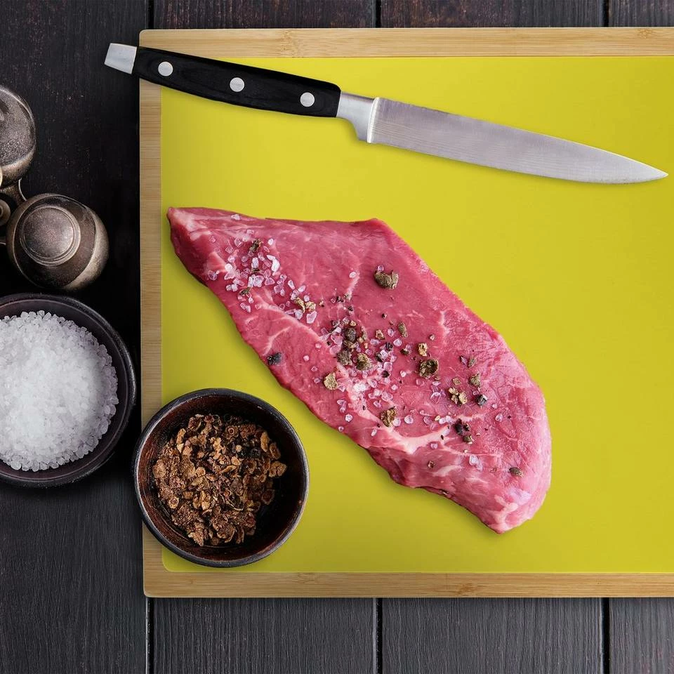 - 7 in 1: Schneidebrett Set für die Küche bestehend aus einem Bambusbrett und 6 bunten Schneidematten