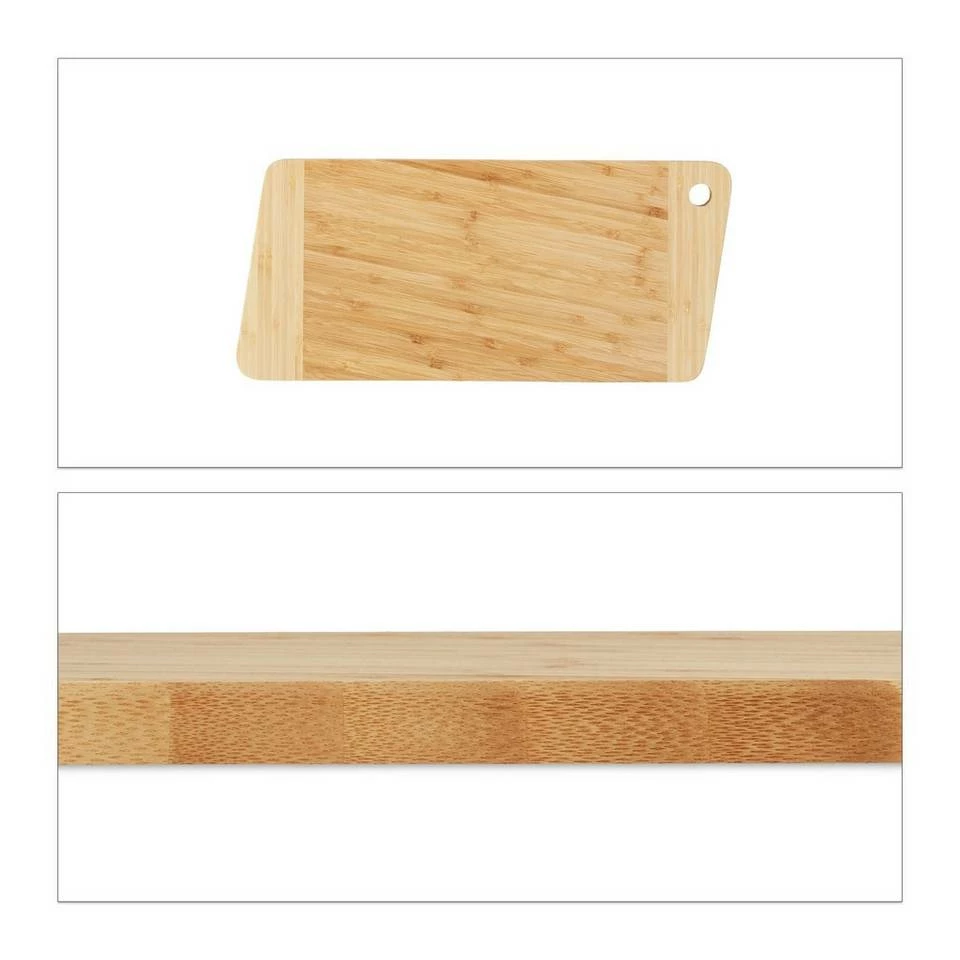 Schneidebrett aus Bambus in natürlicher Optik Mit dem langen Schneidebrett aus Bambus können Sie nicht nur Brot und Baguette hervorragend in Scheiben schneiden, sondern auch Fleisch tranchieren. Das massive, dicke Küchenbrett ist zu 100 Prozent aus Bambus. Es ist geruchsneutral und antibakteriell. Außerdem verfügt es durch die abgerundeten, angeschrägten Kanten über ein ansprechendes Design mit natürlichem Schick. Richten Sie auf dem Servierbrett eine schöne Käseplatte an oder stellen Sie ein abwechslungsreiches Vesperbrett zusammen. Bei Nichtgebrauch können Sie es an dem Loch platzsparend aufhängen.
