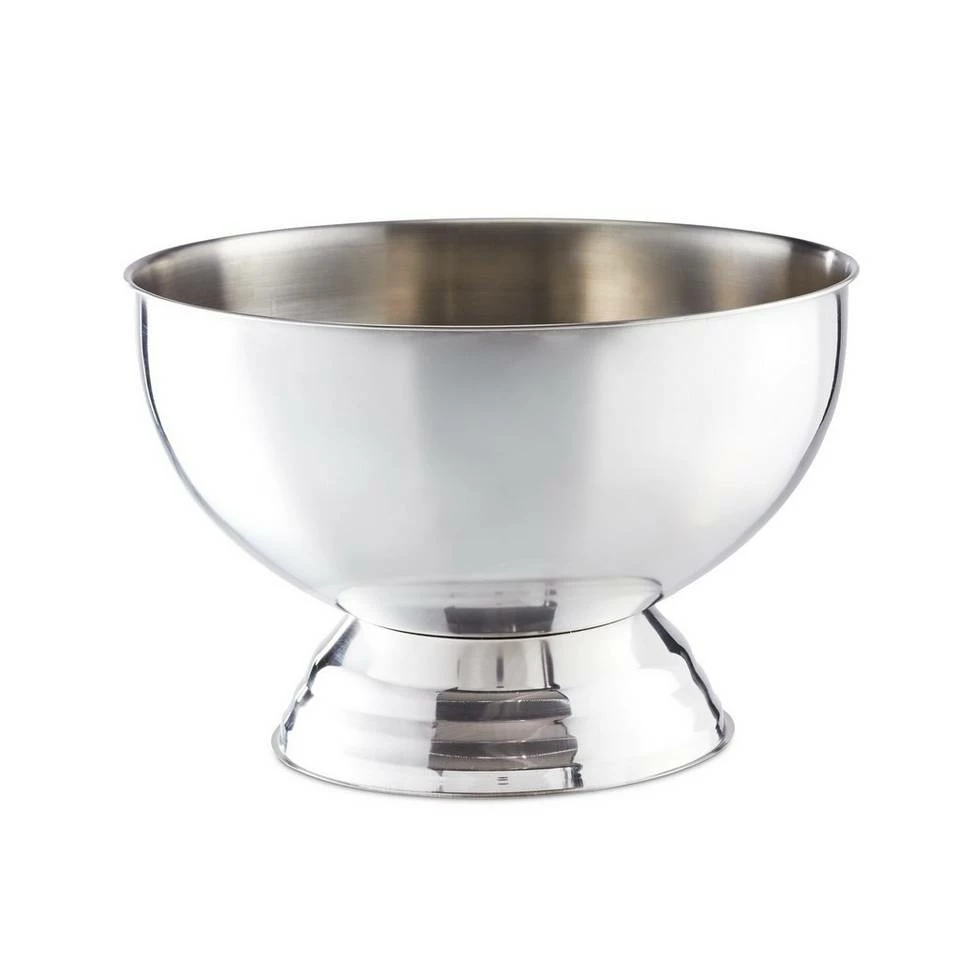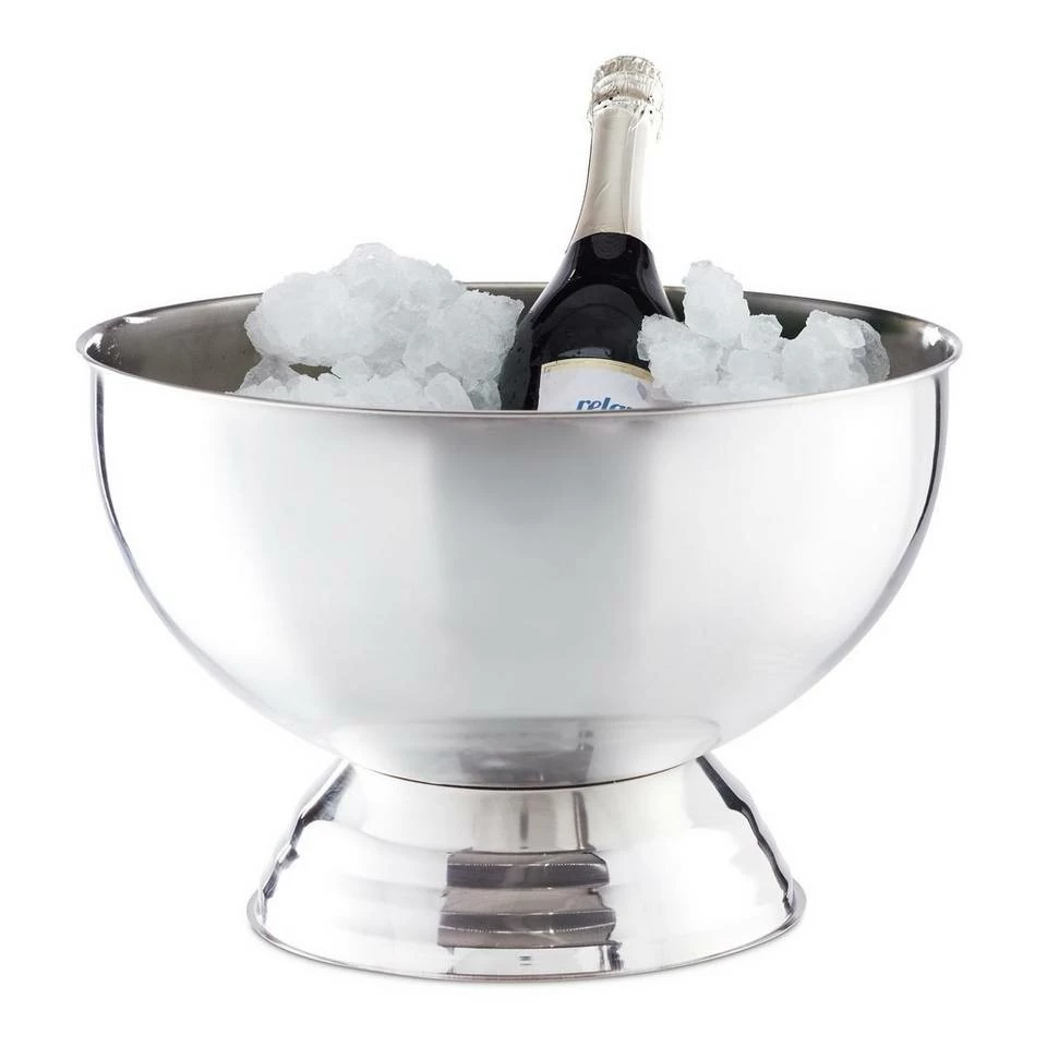 Eleganter Flaschenkühler als praktische Tischdeko Die große Sektschale hält, mit Crushed Eis gefüllt, gleich mehrere Flaschen kalt. Gut vorgekühlt im Kühlschrank sind Wein, Sekt und andere Getränke dank des Eiswürfelbehälters lange auf Trinktemperatur. Der Edelstahl Sektkühler in Silber ist hochwertig und schick anzusehen und für feierliche Anlässe genau das Richtige auf dem Tisch. Ob auf einer Hochzeit im Freiem oder zu einer Indoor Geburtstagsfeier, der Sektkühler macht etwas her. Pflegeleicht lässt er sich auch in der Spülmaschine reinigen. Achtung: Der Sektflaschenkühler ohne Strom hat selbst keine aktive Kühlfunktion und muss mit Eiswürfeln befüllt werden. Die Getränke immer vorkühlen.