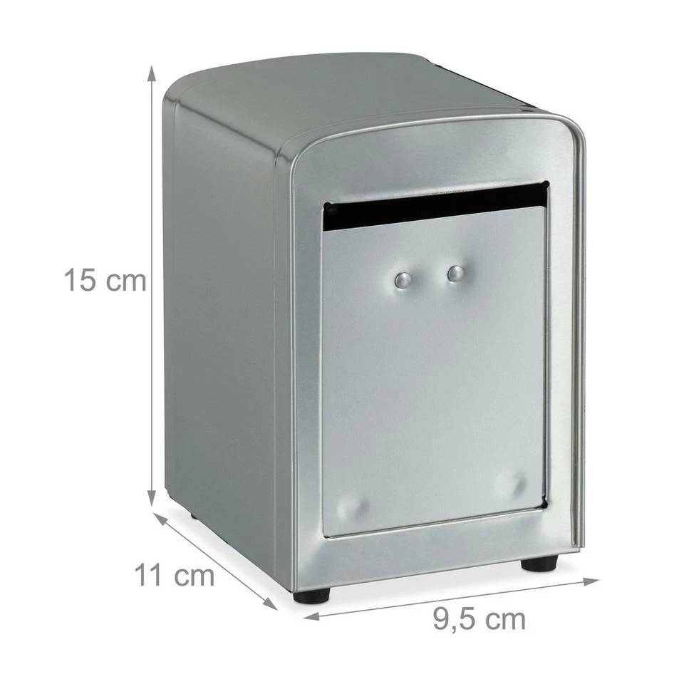 Retro Serviettenspender für Gastronomie & Zuhause Der Serviettenspender im Retro Look findet besonders Einsatz in der Gastronomie und erinnert mit seinem Aussehen an die American Diner der 50er Jahre. Um Kleckereien schnell zu beseitigen, ist der Papierspender mit Servietten auf dem Tisch immer in Reichweite. Der Serviettenhalter wurde für Servietten der Größe 8 x 12 cm hergestellt und ist nachfüllbar. Damit er nicht rutscht, hat er Gumminoppen an der Unterseite. Durch das schlichte, einfarbige Design passt der Serviettenspender in jede Umgebung.