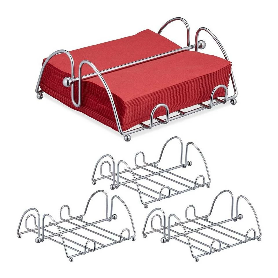 Serviettenspender in Edelstahl-Optik im 4er Set Dieser geschmackvolle Serviettenhalter aus glänzendem Metall präsentiert nicht nur die Papierservietten griffbereit auf dem Tisch oder dem Buffet, dank des Stabes werden die Servietten in der Ablage festgehalten. So bleiben diese auch bei einem kleinen Windstoß bei Feierlichkeiten im Freien in dem Halter und wirbeln nicht durch die Gegend. Das edle glänzende Design ist zudem zeitlos und passt auf jede Tafel. Nutzen Sie den Servietten Korb für Servietten bis zum handelsüblichen Format 33×33 cm.