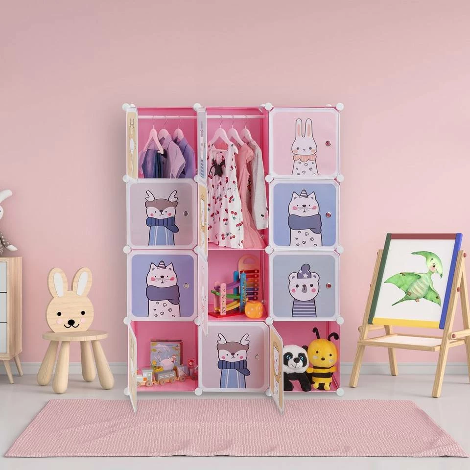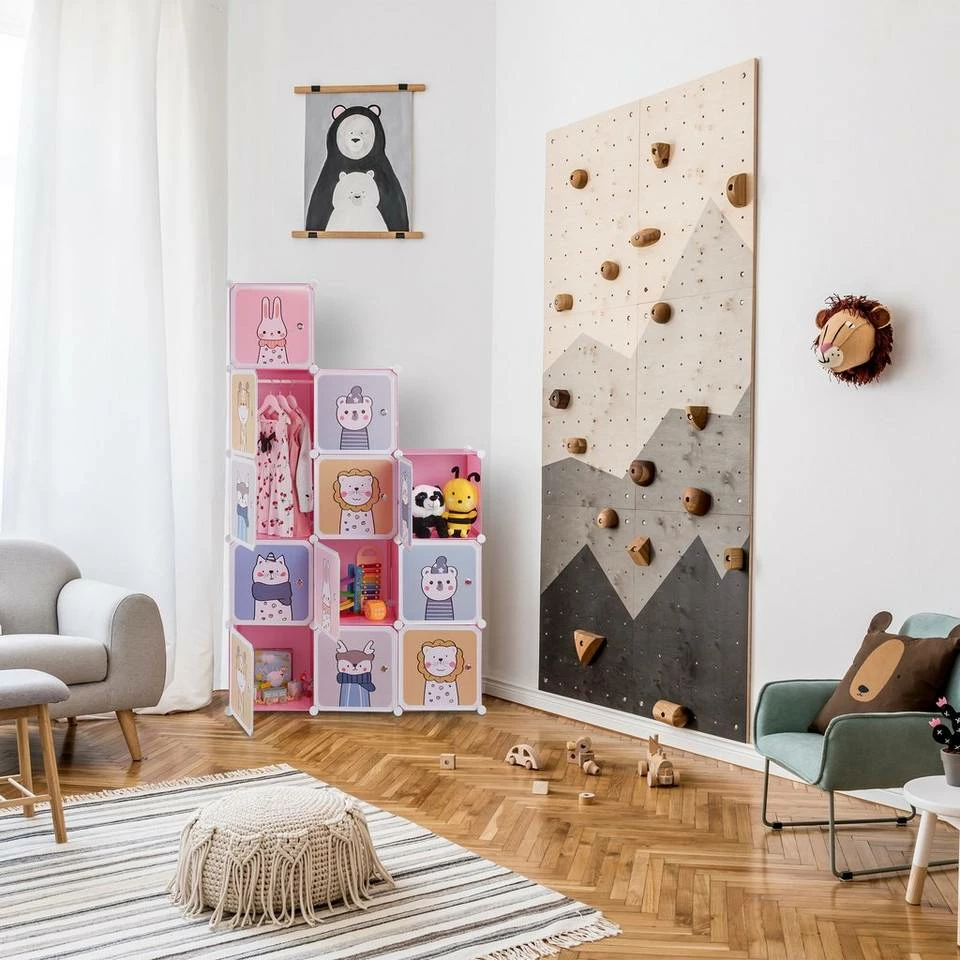 DIY Kinderzimmerregal mit 2 Kleiderstangen Das individuelle Steckregalsystem für das Kinderzimmer ist die ideale Aufbewahrungsmöglichkeit für Kleidung, Spielzeug und mehr. Das Regalsystem aus Kunststoff-Platten und Steckverbindungen ermöglicht einen Aufbau in die Höhe oder in die Breite – ganz nach Wunsch. Dank der 2 Kleiderstangen lassen sich Jacken und Oberteile ordentlich aufhängen. Das Highlight des Steckschranks sind die Türen mit lustigen Tier-Motiven im Comic-Design, die bei allen Kindern garantiert für Begeisterung sorgen werden.