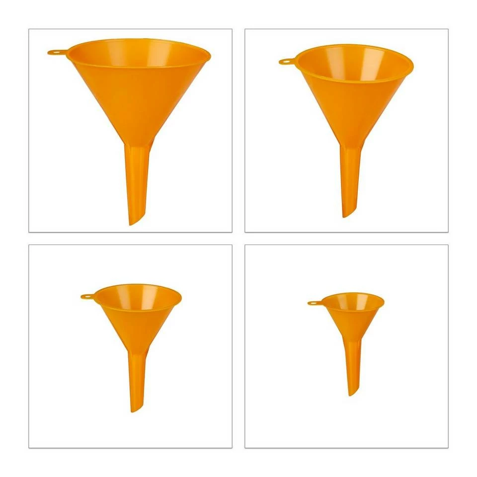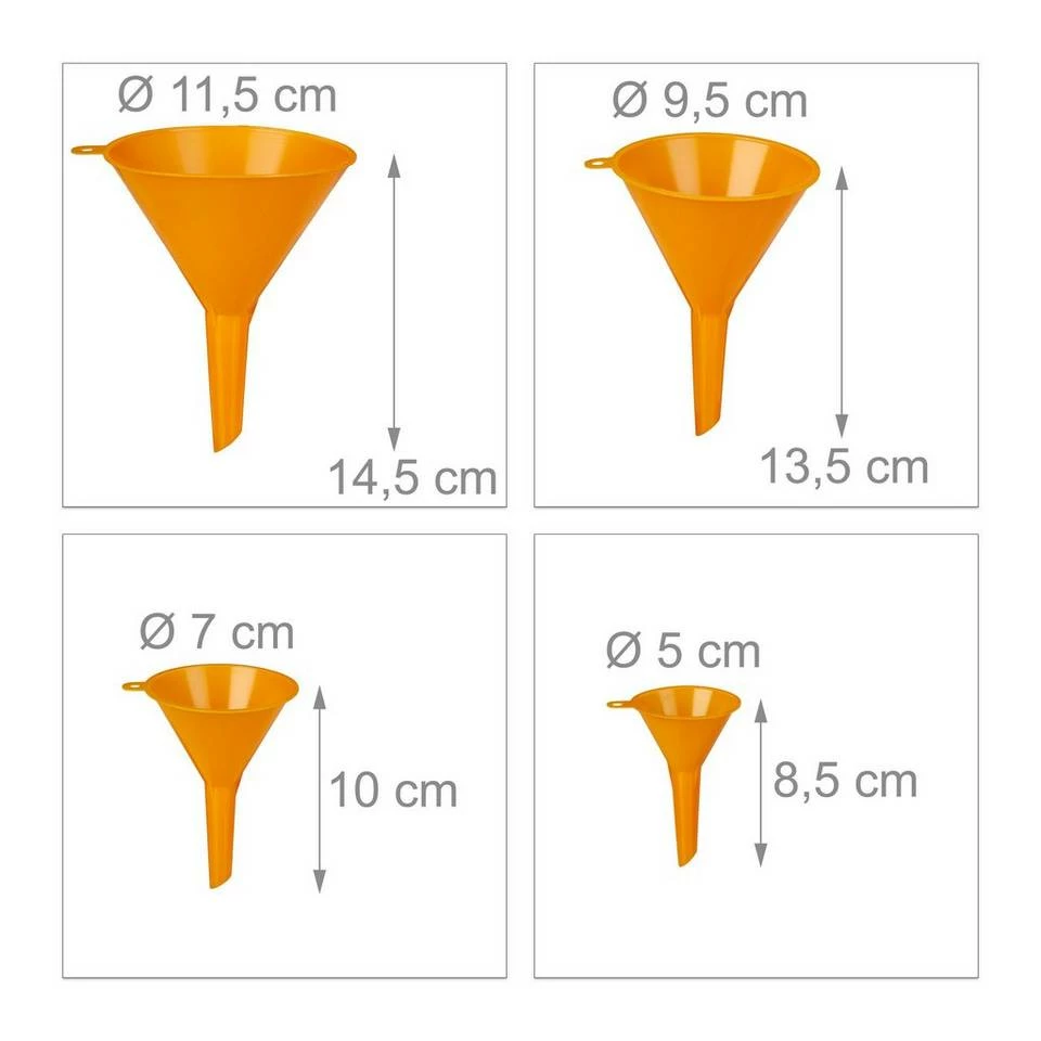 - Trichtersatz: Die 4 orangefarbenen Trichter sind unterschiedlich groß – Platzsparend stapelbar