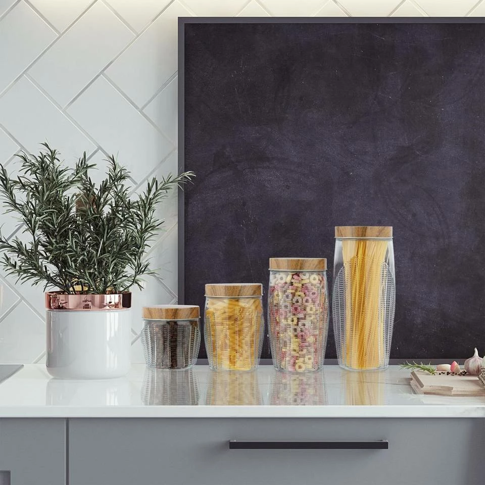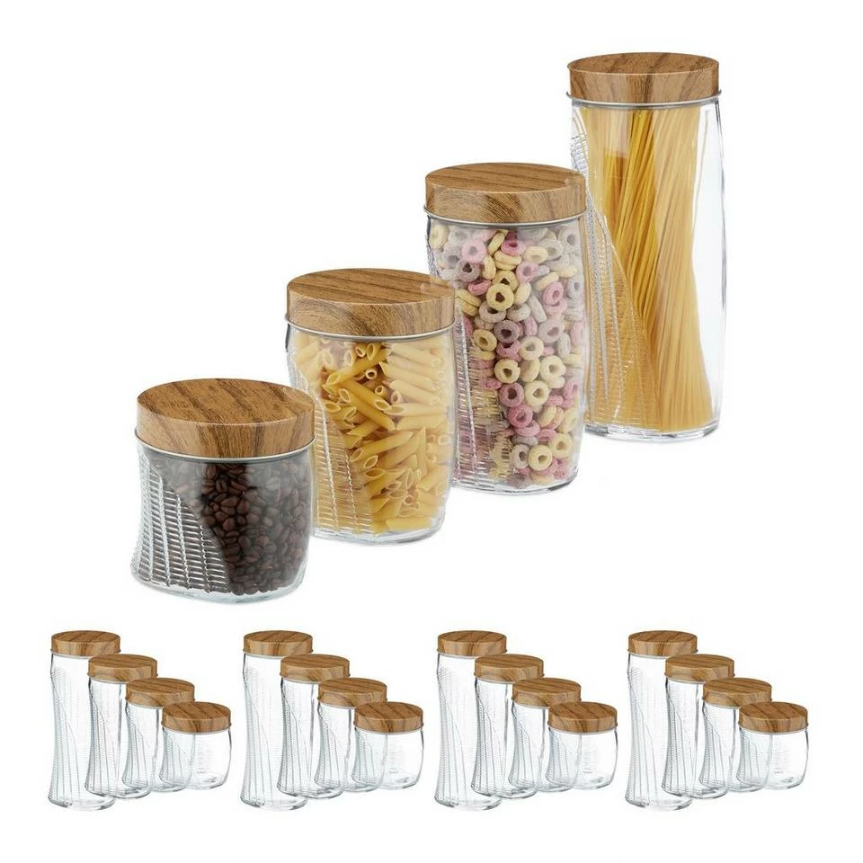 Glasbehälter mit dekorativem Relief Die Verpackungen von Lebensmitteln stapeln sich in Ihrem Küchenregal und Sie haben keinen Überblick mehr über Ihre Vorräte? Damit ist nun Schluss. Mit dem Vorratsglas Set in 4 Größen lagern Sie Müsli, Linsen, Nudeln, Mehl und mehr übersichtlich und platzsparend. Dank des Schraubdeckels wird der Inhalt der Pastagläser sicher verschlossen, wodurch dieser länger frisch bleibt. Auch das Design überzeugt: Der Deckel in Holzoptik und das halbseitige Reliefmuster sind tolle Hingucker. Hinweis: Die Lebensmittelgläser können per Hand mit warmen Wasser gereinigt werden.
