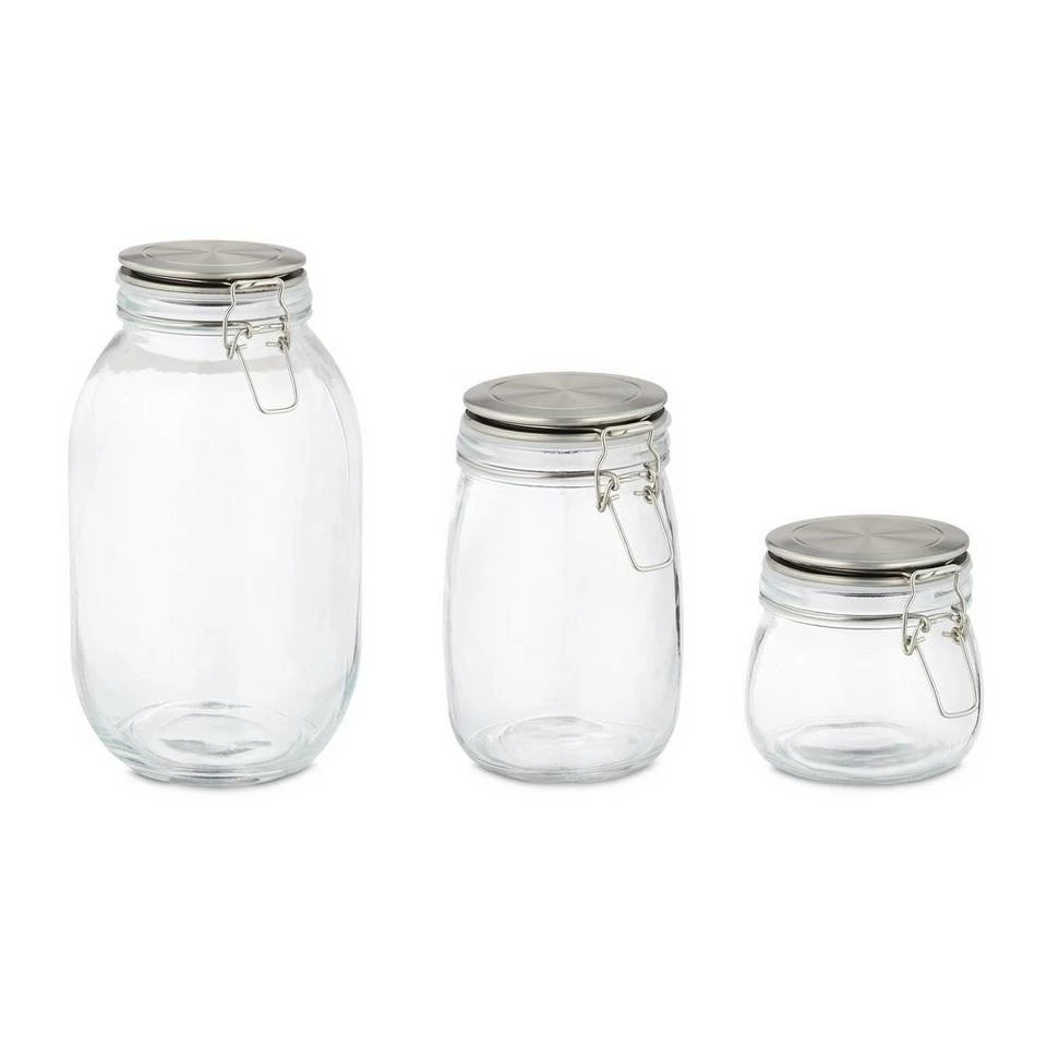 Glasbehälter in 3 verschiedenen Größen Wenn sich der Sommer dem Ende zuneigt, ist das die perfekte Zeit, um saisonale Obst- und Gemüsesorten einzumachen und in die kälteren Jahreszeiten mitzunehmen. Die Bügelhalter der Einmachgläser verschließen den Inhalt sorgfältig und luftdicht. Sie können in diesen Vorratsgläsern nicht nur Einmachen, sondern auch andere Lebensmittel wie z.B. Kakao, Mehl oder Cornflakes aufbewahren. Das praktische Set enthält Vorratsbehälter in 3 verschiedenen Größen, sodass für jeden Bedarf das passende Glas dabei ist.