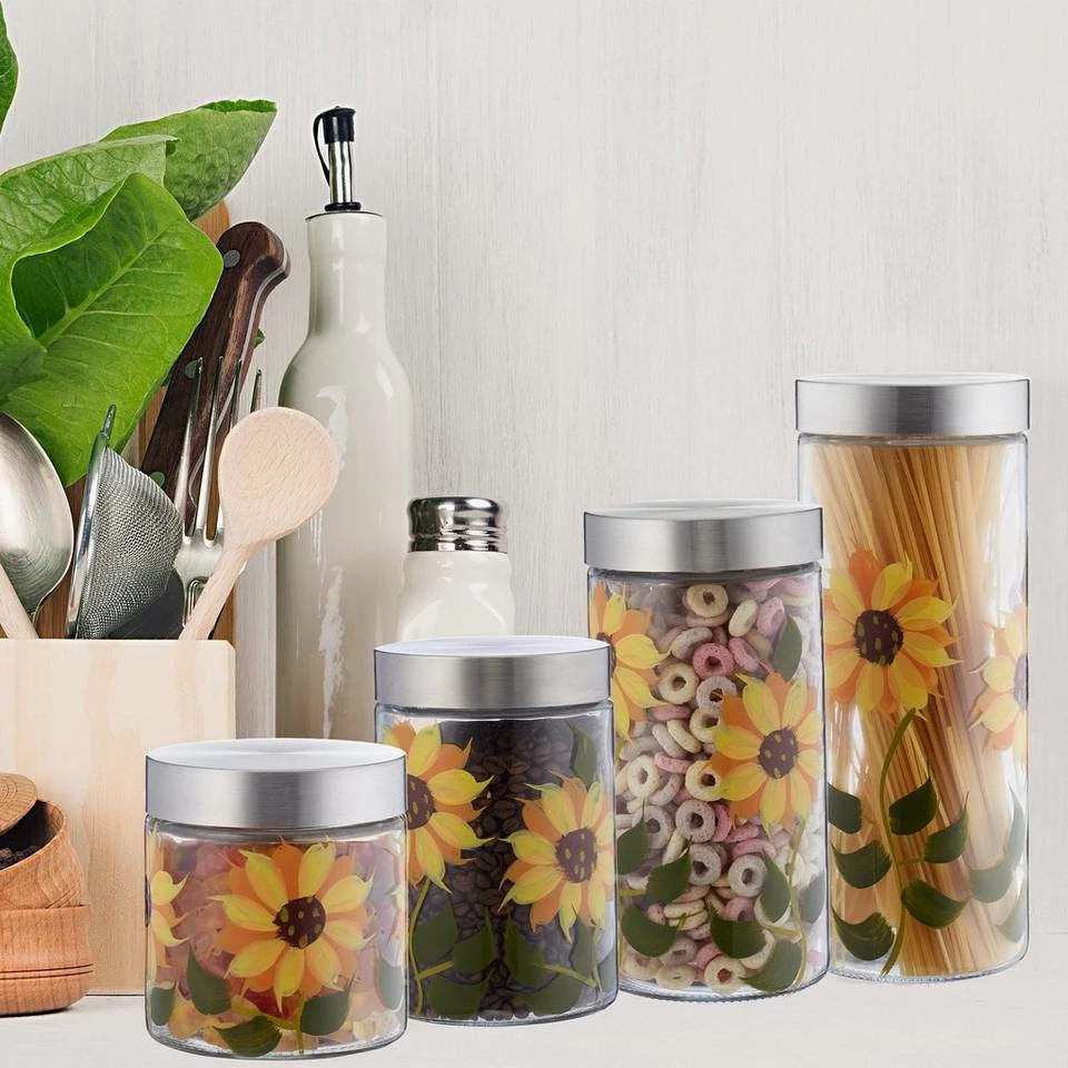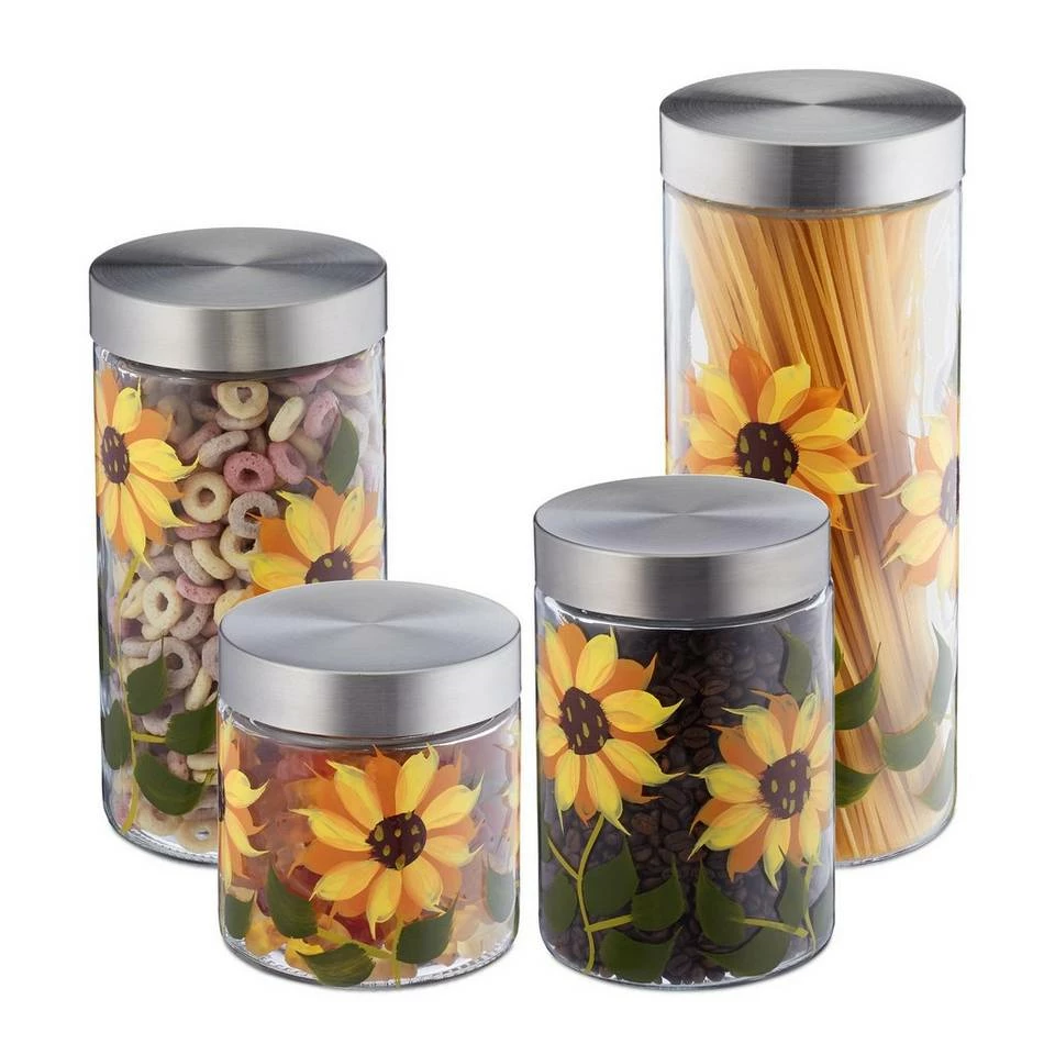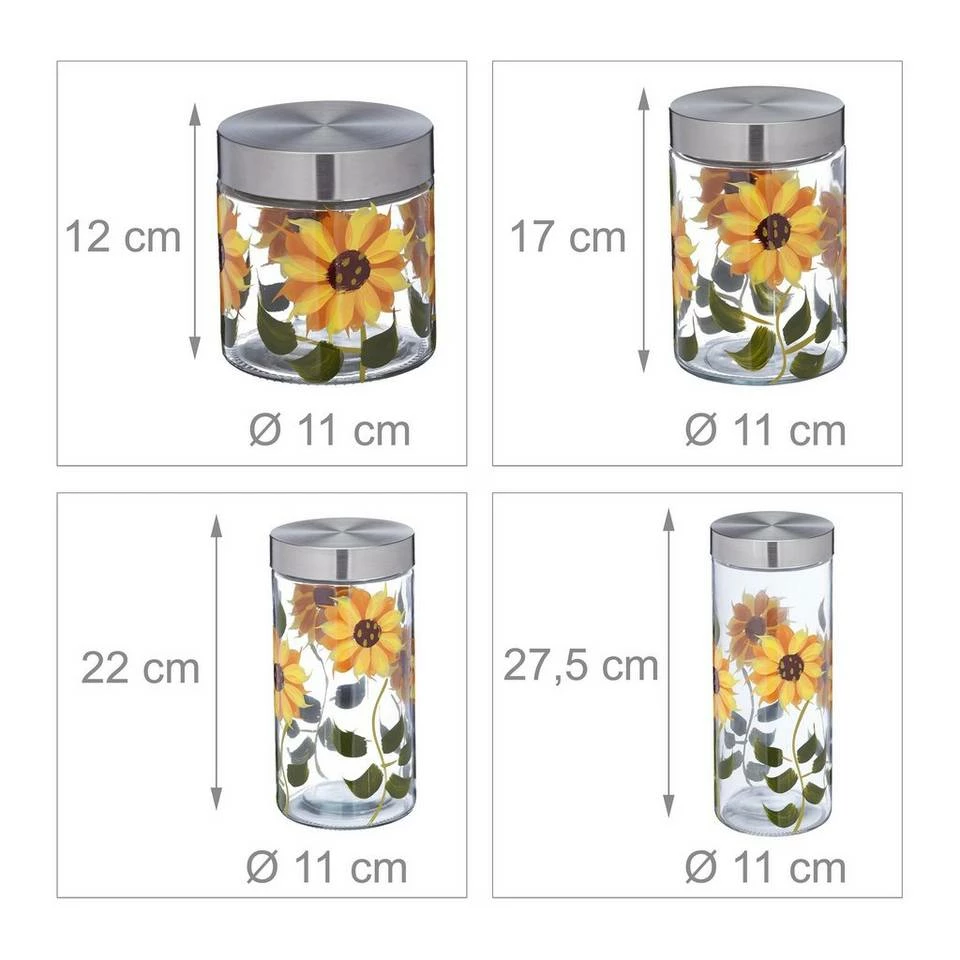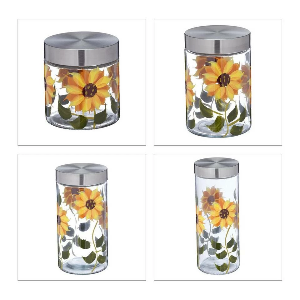 Dekorative Glasbehälter mit Blumenmuster Wenn Sie genug vom Verpackungschaos in Ihrer Küche haben, sind diese Vorratsgläser die richtige Wahl. Dank der verschiedenen Größen haben Sie für unterschiedliche Bedürfnisse das passende Aufbewahrungsglas parat. Lagern Sie Nudeln, Müsli, Kaffeebohnen, Reis und mehr platzsparend, übersichtlich und dank fest schließendem Edelstahldeckel auch luftdicht. Die Glasdosen sorgen zudem für eine einheitliche Optik auf dem Regal und sind durch das handgemalte Sonnenblumenmuster äußerst dekorativ.