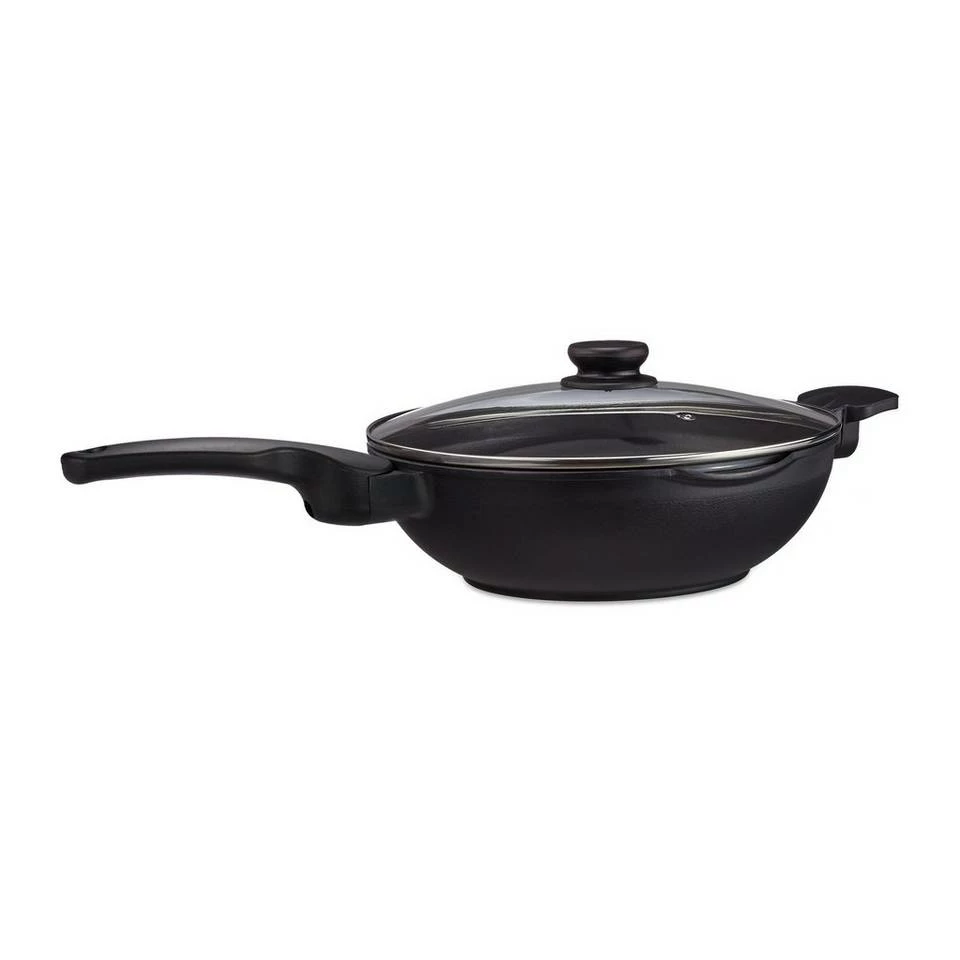Induktionswok für asiatische Küche Endlich können Sie Gemüse auf traditionelle, chinesische Art in Ihrem eigenen Wok zubereiten. Die Aluguss-Pfanne leitet die Hitze besonders gut weiter. Durch den handlichen Griff und die extra Halterung am Rand gelingt das Tragen auch mit vollem Wok mühelos. Servieren Sie Ihr Essen so auch noch heiß aus der Pfanne. Die Soße können Sie geschickt über den Ausgießer fließen lassen. Die antihaftbeschichtete Wok Pfanne mit flachen Boden ist für alle Herdarten geeignet. Achtung: Vor dem Erstgebrauch die Alupfanne bitte mit Spülmittel reinigen und danach auskochen.